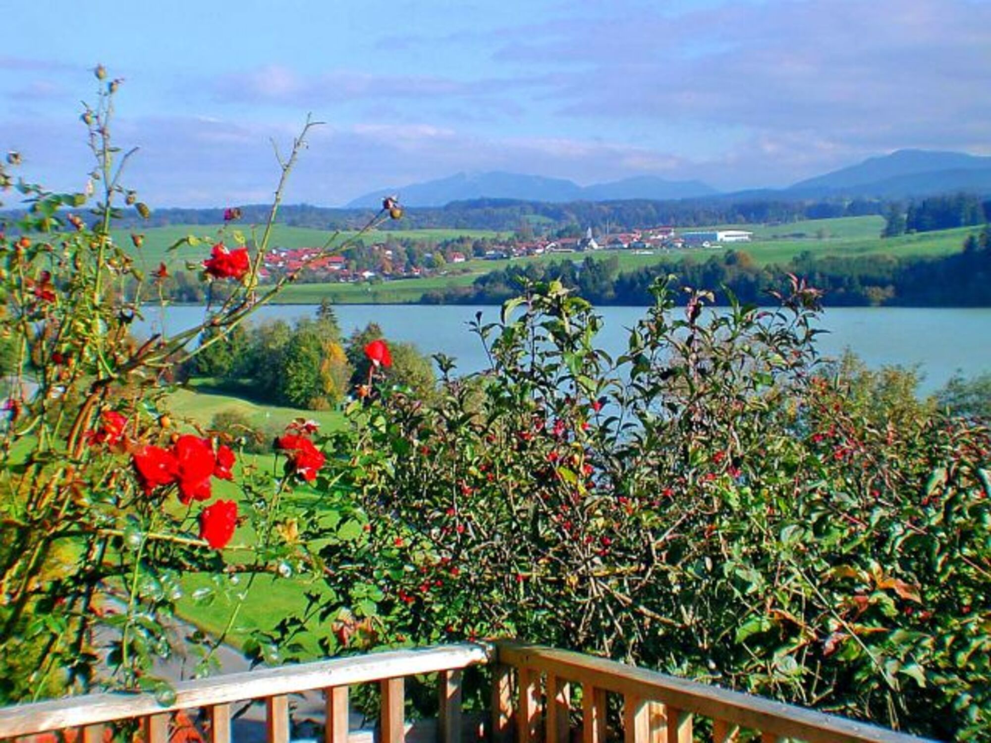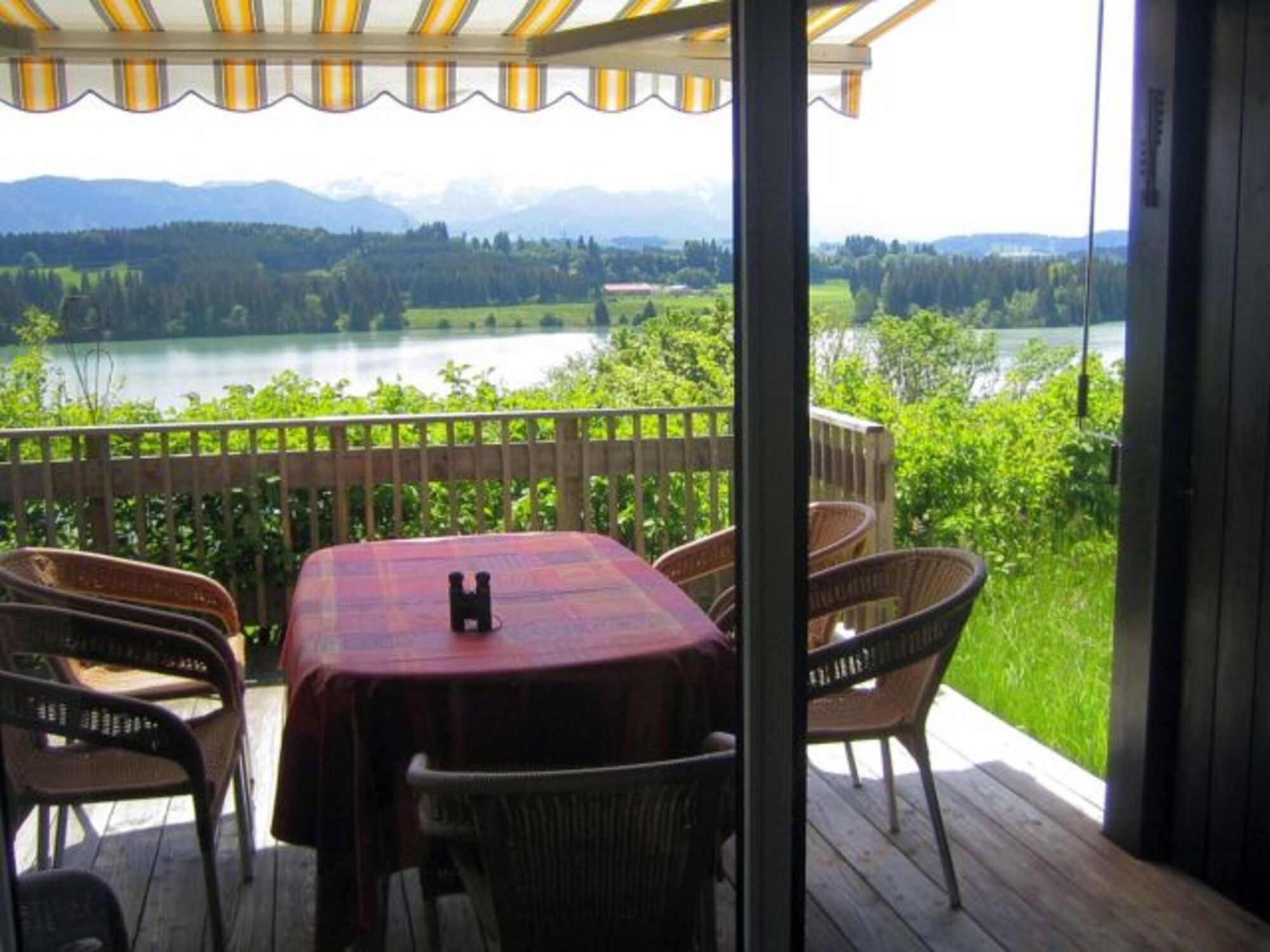 Von der großen, gut ausgestatteten Süd- Terrasse mit Markise hat man einen uneingeschränkten Blick über den Lechsee auf das beeindruckende Alpenpanorama - vom Ammergebirge über die Lechtaler- bis zu den Tannheimer Alpen.