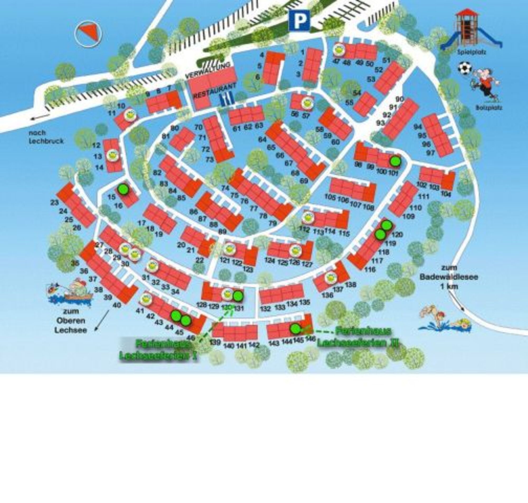 Herrliche Aussichten erwarten Sie vom Ferienhaus über dem LechseeIn exponierter Lage befindet sich das "Haus überm See II " (siehe Feriendorf Lageplan)