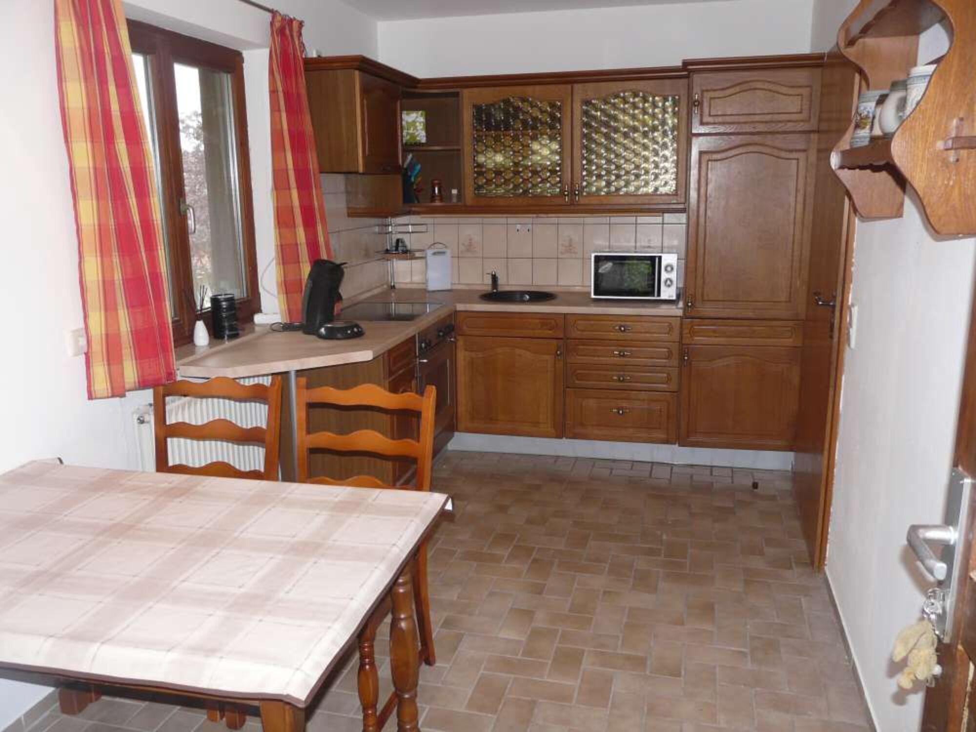 Sehr ruhige Lage, freie Natur am OrtsrandAb sofort bieten wir wieder unser zusätzliches Fremdenzimmer an. Dieses Zimmer - Nichtraucherzimmer - mit eigenem Eingang, hat ca. 25 m² und wurde komplett renoviert, modernisiert, und neu eingerichtet: Korkparkettboden und Fliesen; Doppelbett 180x200, bezogen, Ersatzbettwäsche, Radiowecker, tv, Sitzgruppe, Zentralheizung, Kaminofen; Nasszelle mit Dusche, Waschbecken, WC, beheizter Handtuchhalter, Hand- und Badetücher, Fön, Abluftventilator; Miniküche mit Kühlschrank / Eisfach, Duo-Kopchplatte, Dunstabzug, Spülbecken, Mikrowelle, Kaffeemaschine, Toaster, komplett mit Geschirr ausgestattet. Es kann als eigenes Gästezimmer, Monteurzimmer oder möbliertes Zimmer, oder aber auch zur Ferienwohnung dazu gebucht werden. Das Zimmer befindet sich unterhalb unserer FeWo und ist über einen 20m langen Weg über den Garten erreichbar. Momentan kann unsere große Terrasse genutzt werden, aber eigene Terrasse ist im Bau; Grillmöglichkeit; Garten wie bei FeWo;
