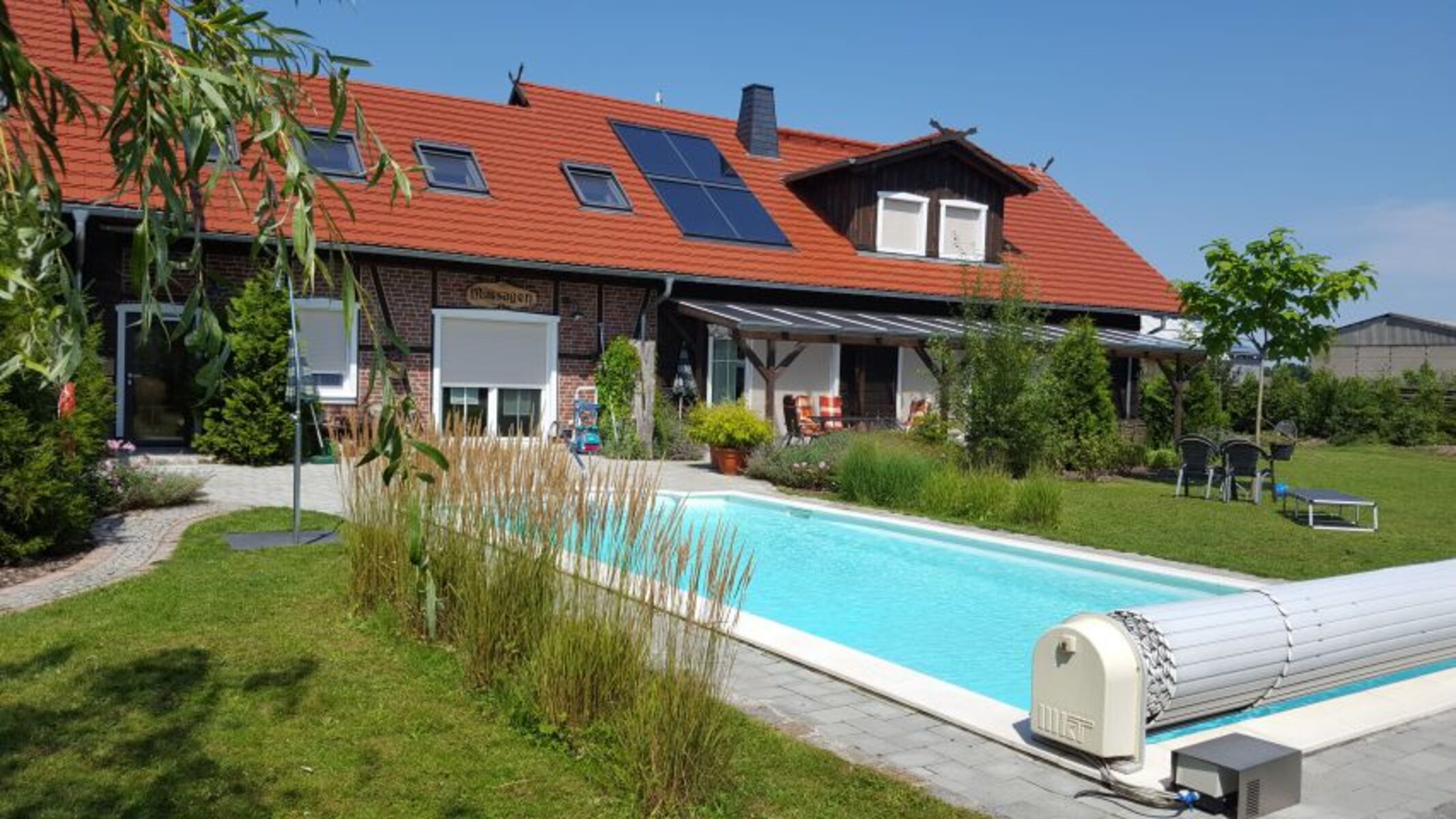 Das FH hat eine sehr große überdachte Terrasse direkt am Pool. Sie haben einen Blick auf einen großen idyllisch angelegten Garten.