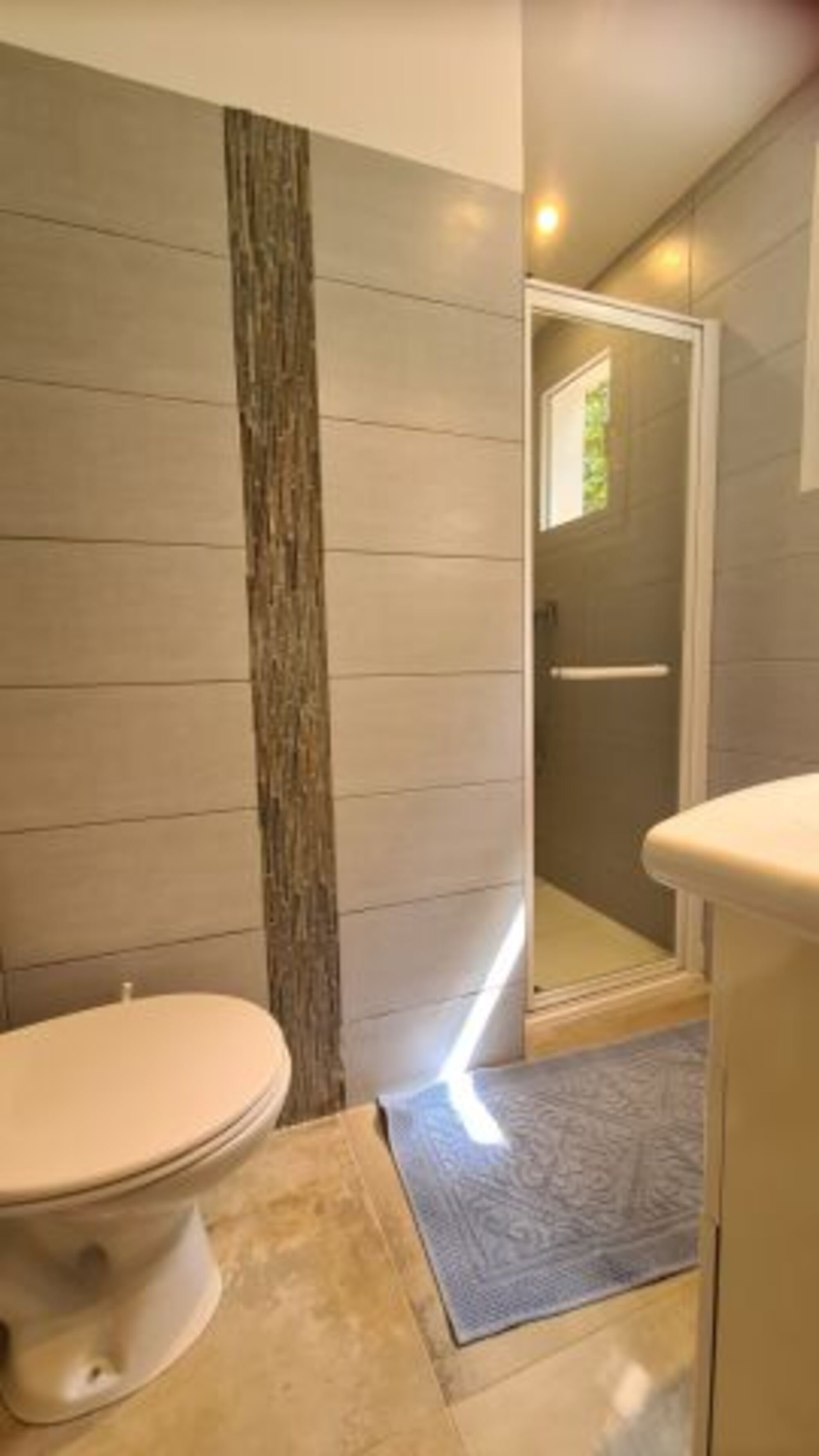 Das Badezimmer mit begehbarer Dusche und WC , Fenster /Blick Garten