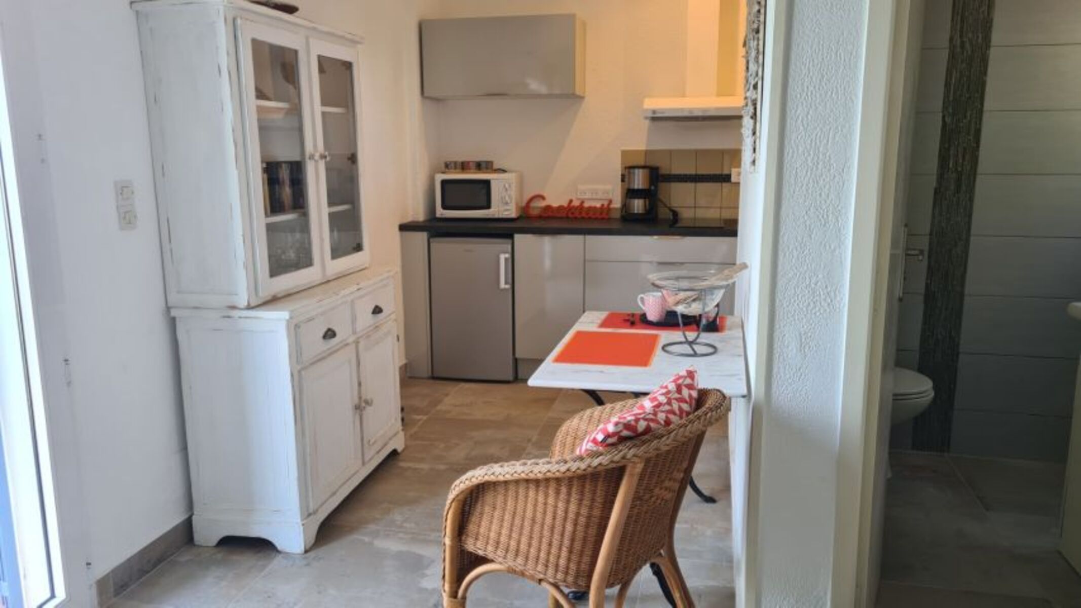 Die helle Ferienwohnung „PALMIER“ für 2 Personen, besteht aus einem großen Raum (ca. 28qm), einem durch eine Tür getrennten Duschbad , WC und einem Fenster zum Garten. In offener Innengestaltung Küche und Wohn- Schlafraum (Bett 1,60m) , so kann der Blick aufs Meer ,selbst vom Bett aus, uneingeschränkt Wirkung zeigen;