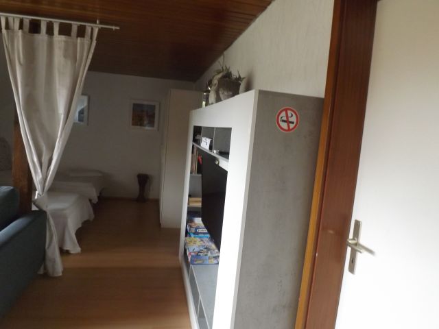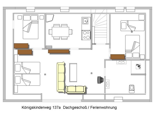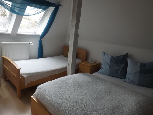 Im Dachgeschoß eines Walmdachbungalows befindet sich diese Ferienwohnung.Die 76qm sind aufgeteilt auf ein Doppelzimmer, ein Dreibettzimmer und ein Wohn/Schlafzimmer mit abgeteiltem Schlafbereich, sowie Küche und Bad.