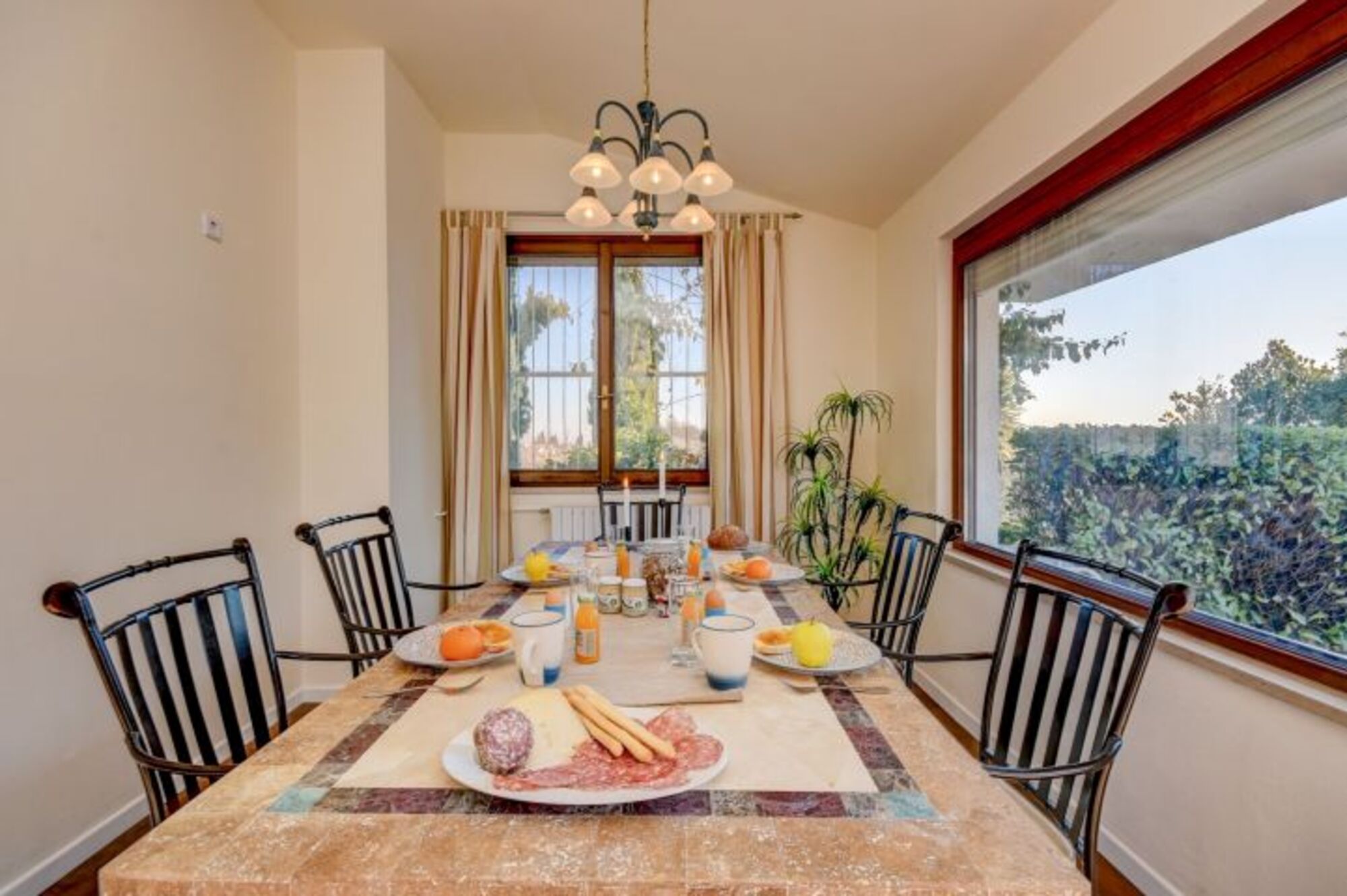 Entspannen Sie im gemütlichen Essbereich mit Panoramafenster am stilvollen Esstisch mit hochwertigen Stühlen. Von hier aus gelangen Sie direkt auf die schöne, großzügige Terrasse mit Tisch und Stühlen, sowie ein bezaubernd schöner Garten mit privatem Pool mit Palmen, Orangenbäume und Oliven.