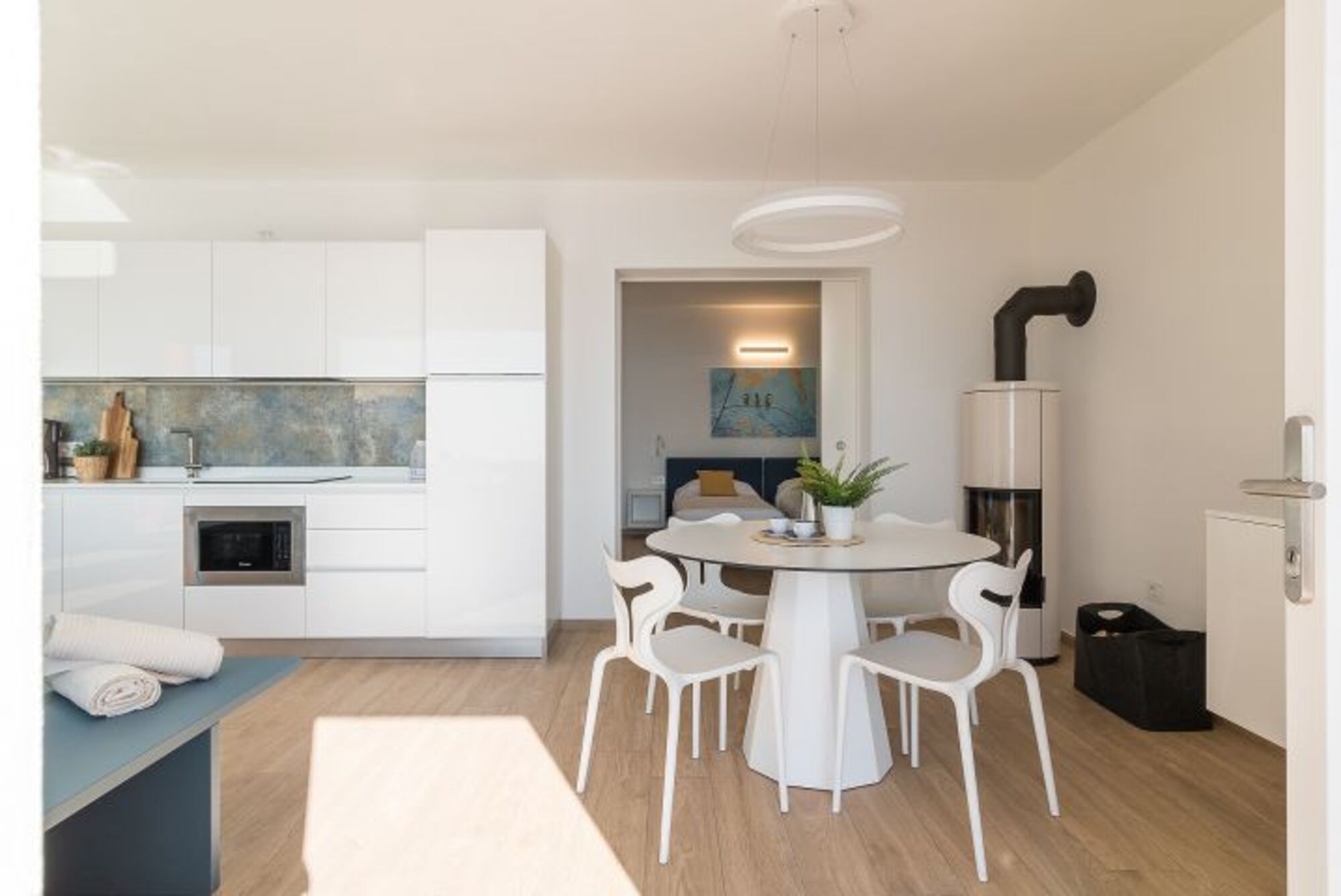 Beim Betreten der Wohnung werden Sie von einer Whirlpool Jacuzzi Wanne mit Traumblick empfangen. Im Wohnzimmer befindet sich ebenso eine Couch, ein 65iger Flachbild- TV mit internationalen Kanälen, Esstisch und Stühle, Holzofen und eine integrierte, moderne vollausgestattete Küche mit Induktionsherd, Kühl-Gefrierkombination, Mikrowelle, Wasserkocher, Spülmaschine, Kaffeemaschine und Toaster.