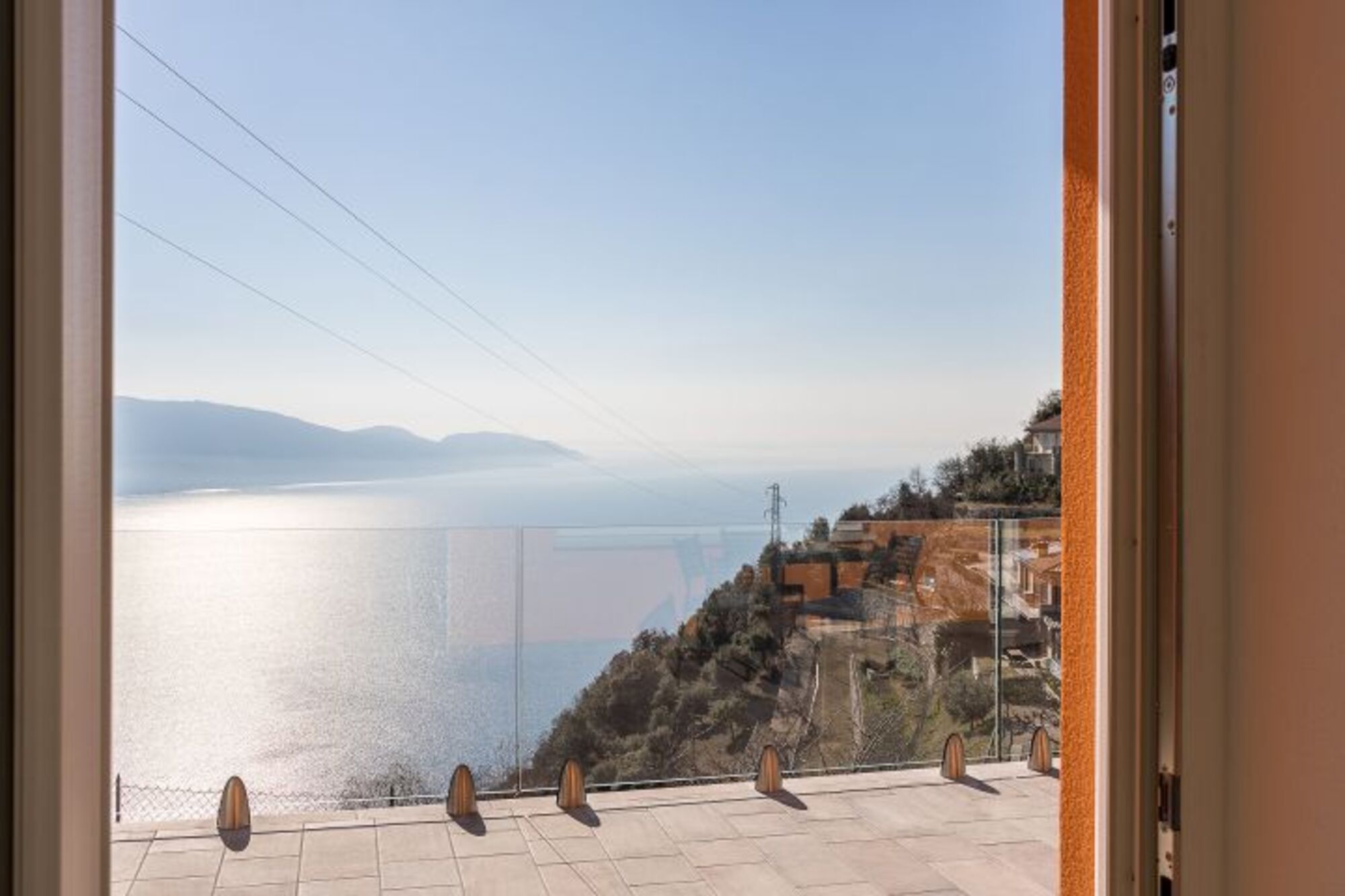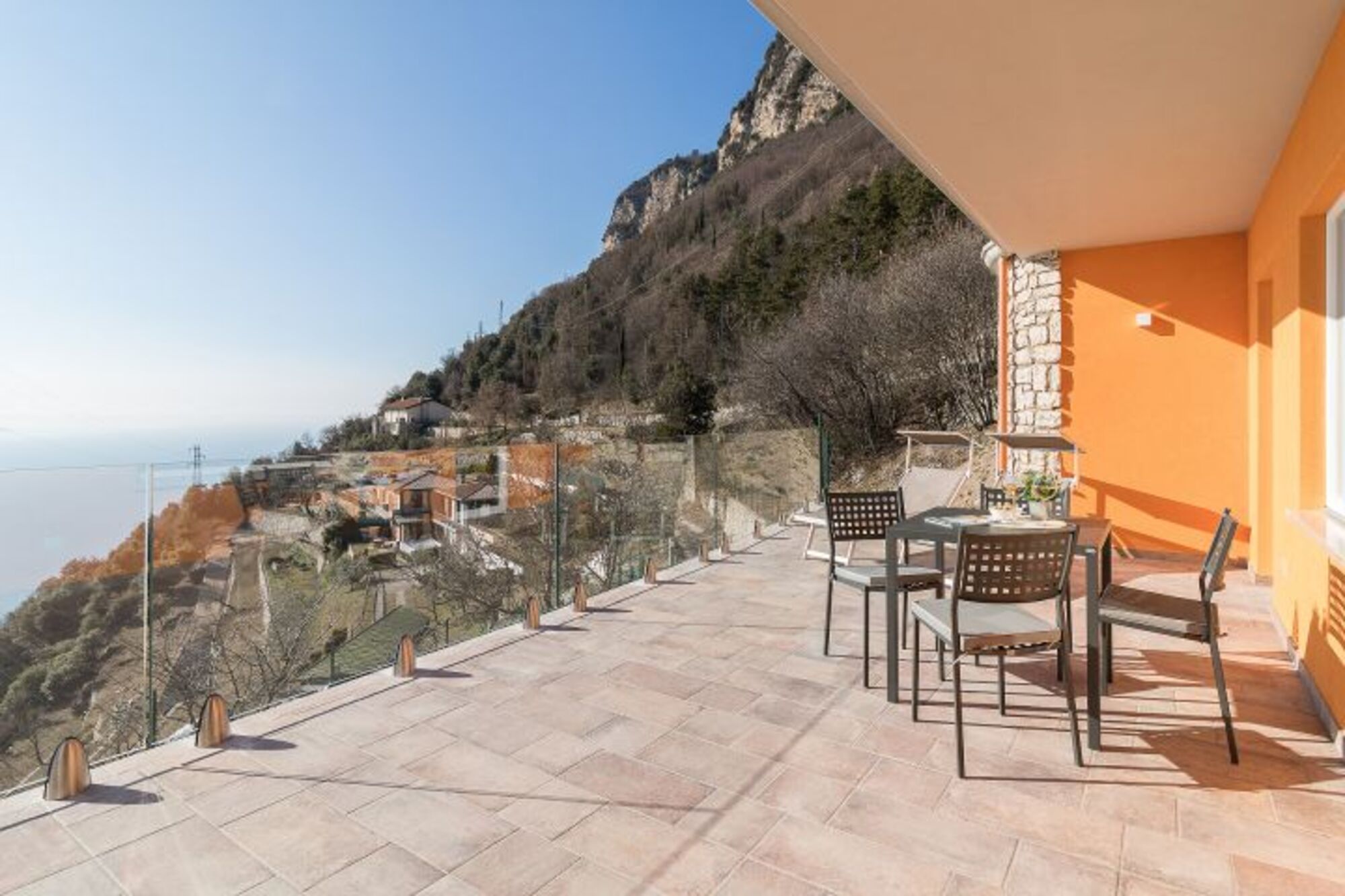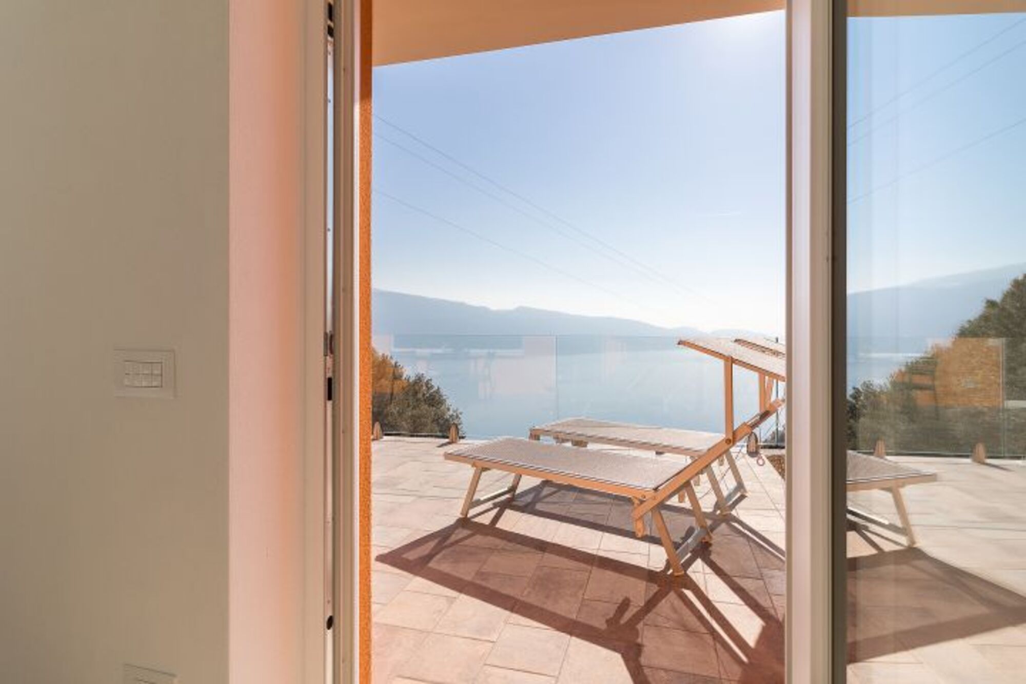 Vom Wohnzimmer hat man direkten Zutritt zur privaten Terrasse mit phantastischem Seeblick, wo man seine Mahlzeiten in einer Traumkulisse einnehmen kann.