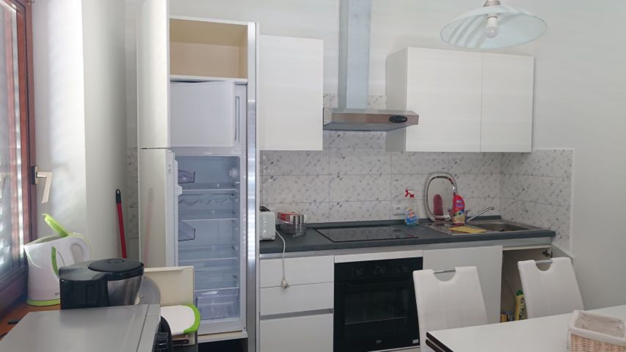 Küche mit großem Kühlschrank und Gefrierfach, Elektroherd + 4 Kochplatten und Geschirrspüler