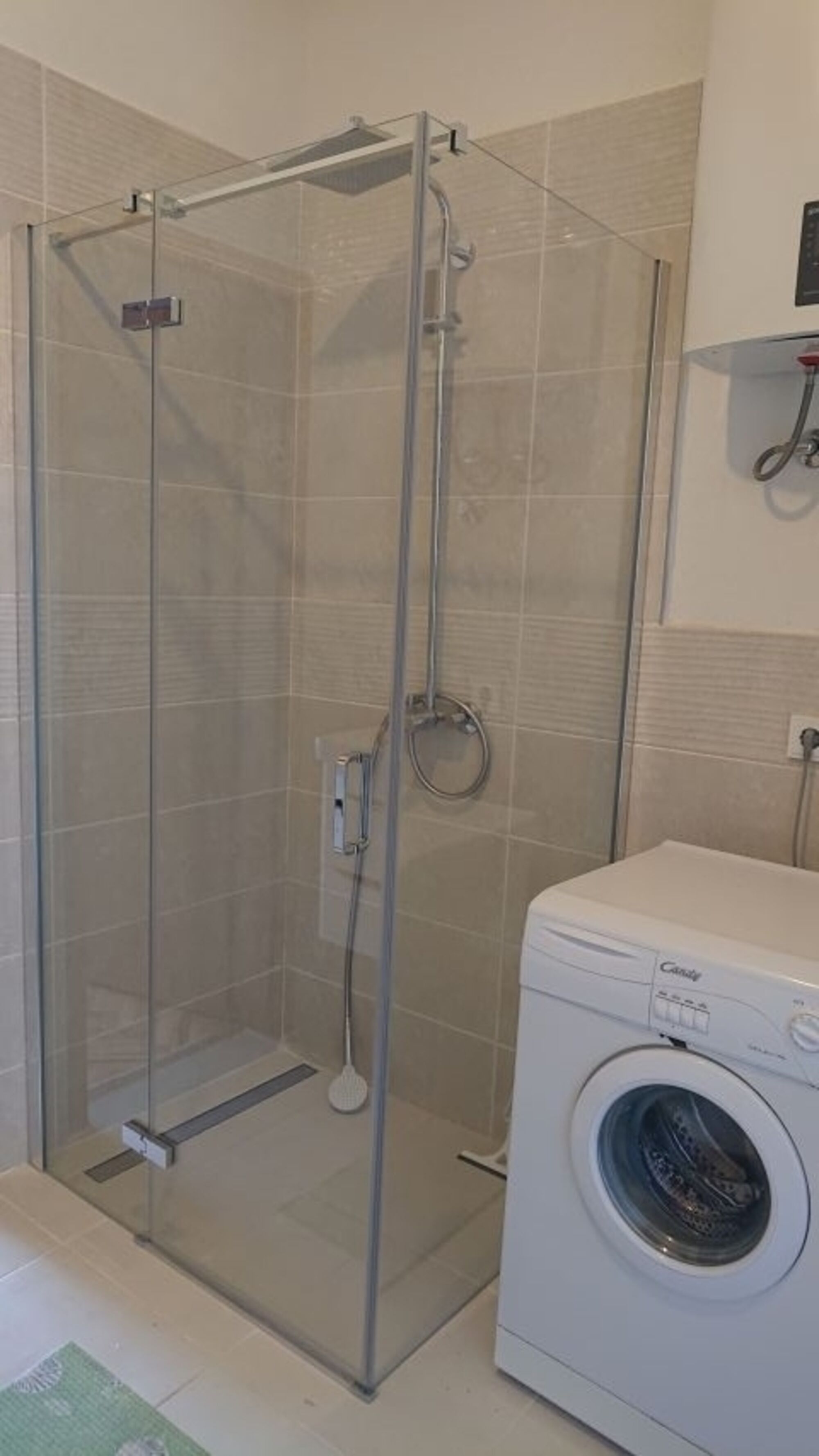 Bad mit Duschkabine, 2 Waschbecken, WC und Waschmaschine