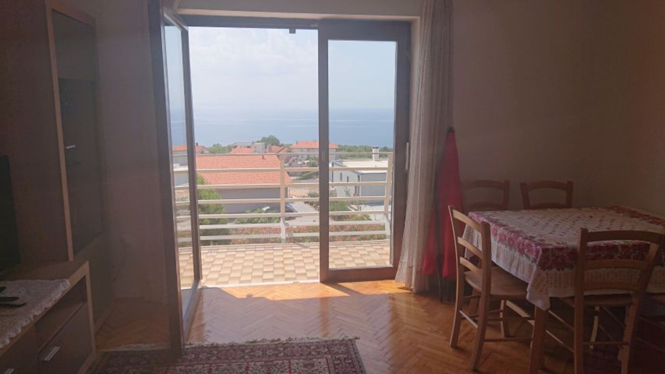 Wohnzimmer mit Klimaanlage, HD TV mit SAT Empfang, große Sitzgarnitur, Esstisch für bis zu 6 Personen und Südbalkon mit Meeresblick