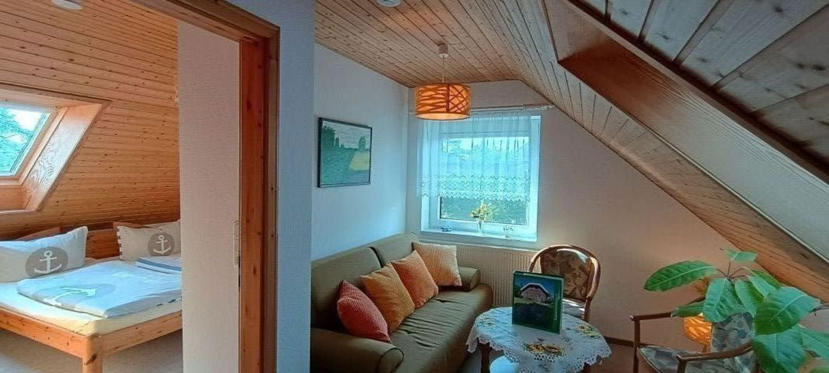 Fewo für 2 Personen, 1. Etage , Größe : 45m² , 1 Wohnzimmer mit Schlafcouch, 1 Tisch und 2 Stühle, LED TV, Radio, 1 Miniküche mit 2 Herdplatten sowie mit Kühlschrank und Gefrierfach, Toaster und Kaffeemaschine, 1 Schlafzimmer mit 1 Doppelbett, 1 Bad mit Dusche und Eckbadewanne, Haartrockner. Handtücher sind mitzubringen. Parkmöglichkeit auf dem Grundstück. Die Bäckerei liegt gleich nebenan. Das Ferienobjekt liegt in zentraler, ruhiger Lage des Ortes Born.