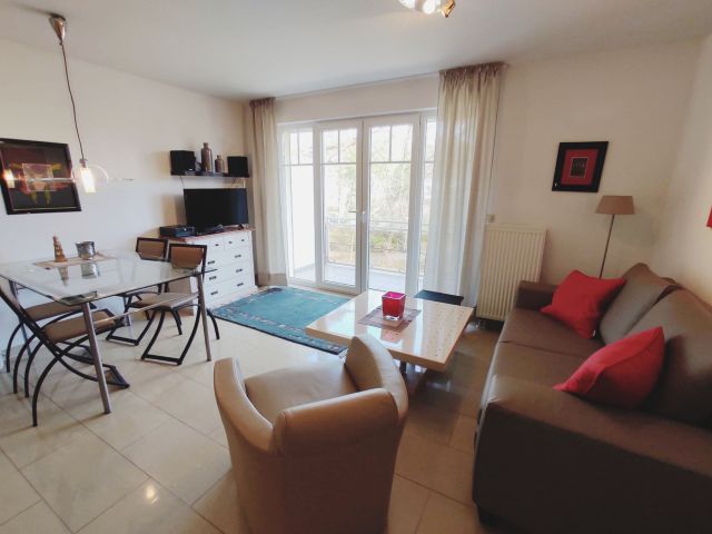 Die Ferienwohnung "Rubin" ist eine 2 Zimmer Wohnung und bemisst 58 qm. Sie verfügt über ein Wohnzimmer mit ausziehbarer Schlafcouch, einem Schlafzimmer mit großem Bett 1,80x2,00m, einer Einbauküche und einem Duschbad. Ein großer Balkon mit Blick zum Kurpark und dem Meer. Zur Wohnung gehört ein Tiefgaragenstellplatz.Ein Fahrstuhl ist vorhanden.
