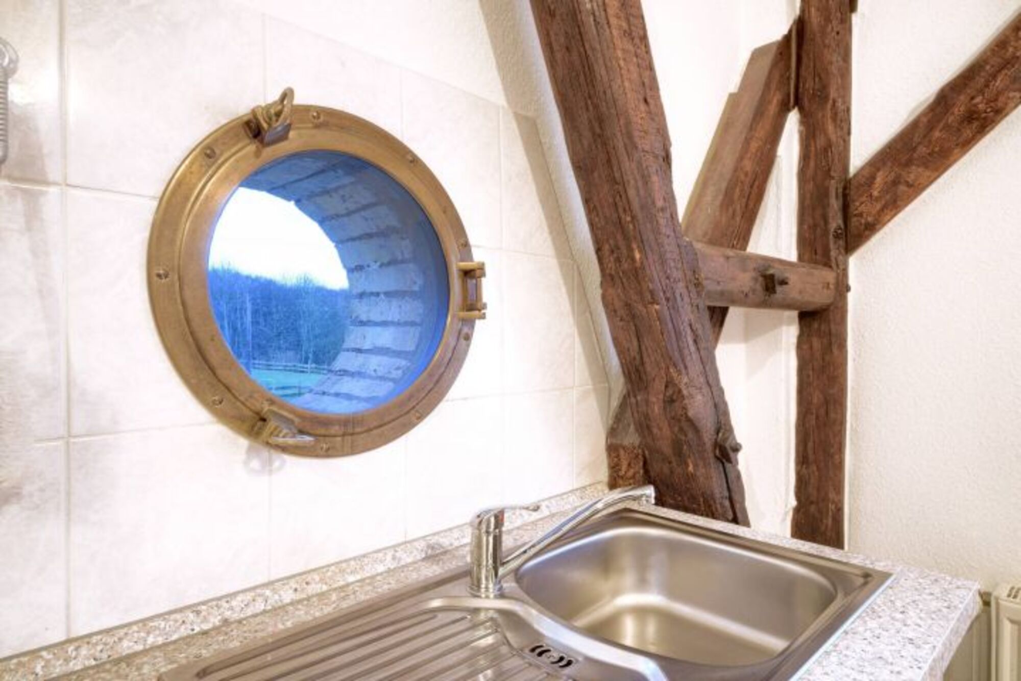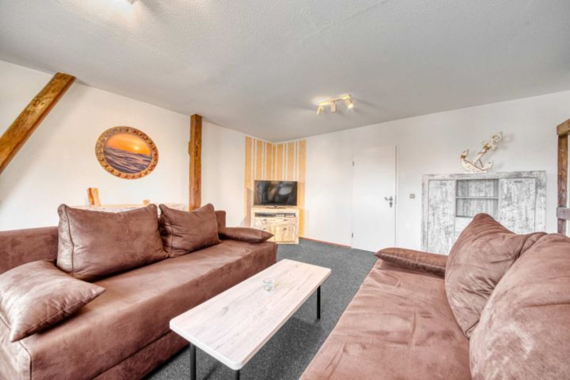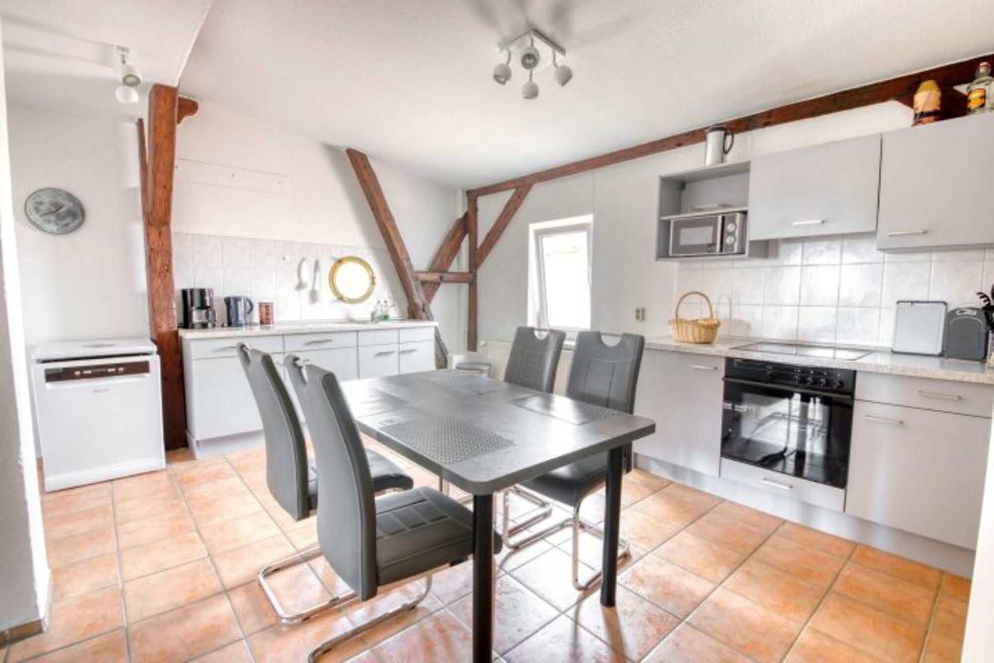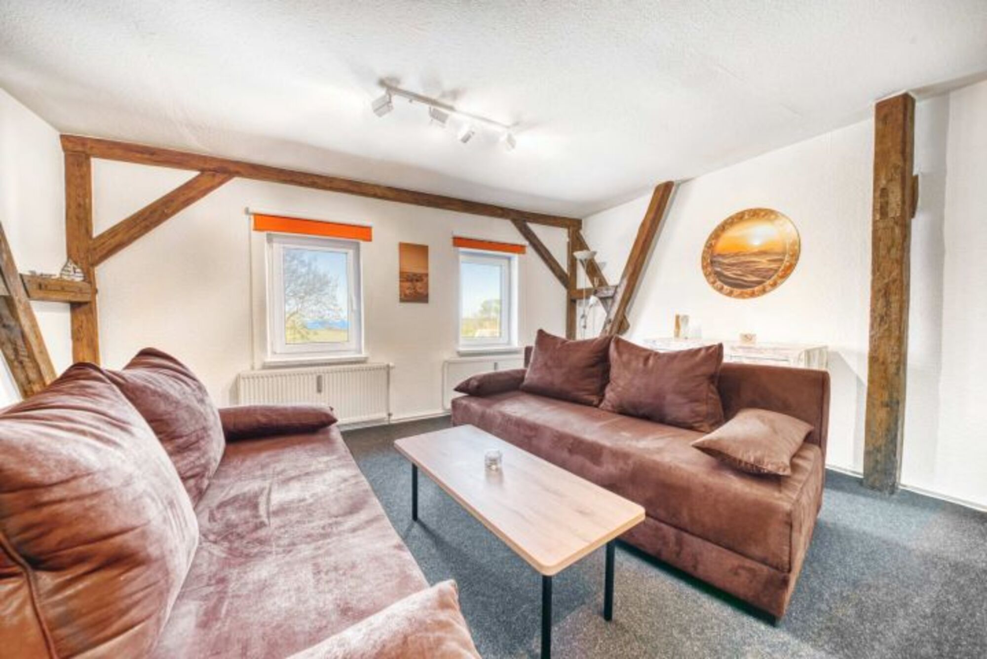 Insel Rügen, Lohme: Unsere große Fewo überrascht mit harmonisch integriertenb historischen Fachwerk, und bietet tatsächlich Meerblick.Unsere 65 qm große 2-Raum-Fewo Seeschwalbe bietet neben reichlich Platz tatsächlich auch noch Meerblick. Das schöne Fachwerk wurde harmonisch in die Raumgestaltung integriert. Die wirklich große Wohnküche mit dem Esstisch bietet viel Platz zum Essen und Kochen. Die beiden bequemen Couchen in Dauerschläferqualität im Wohnzimmer lassen sich in Windeseile zu "Betten" umfunktionieren. Natürlich steht hier auch ein moderner Flachbild-TV, falls das Wetter mal nicht mitspielt. Das Schlafzimmer ist geräumig und beherbergt ein großes Doppelbett. Im Tageslicht-Badezimmer finden sich eine Badewannen-Dusche/WC und ein Handtuchheizkörper..