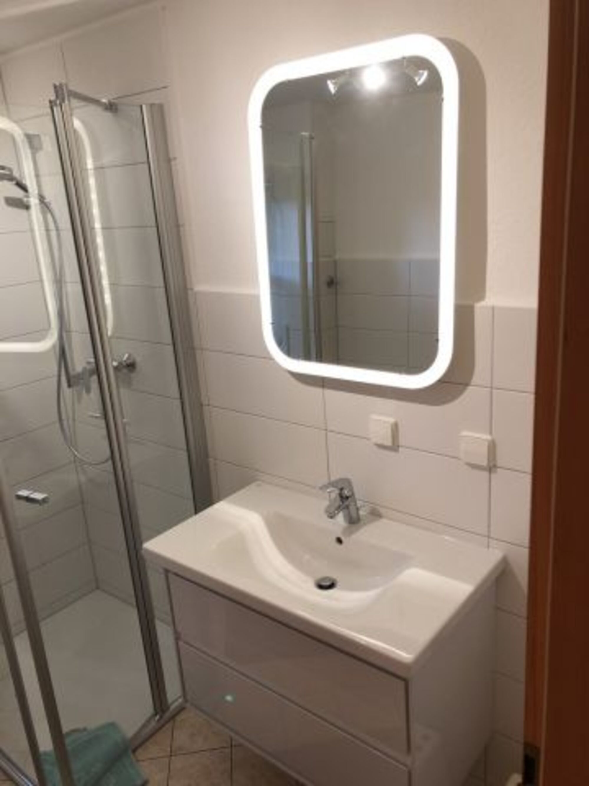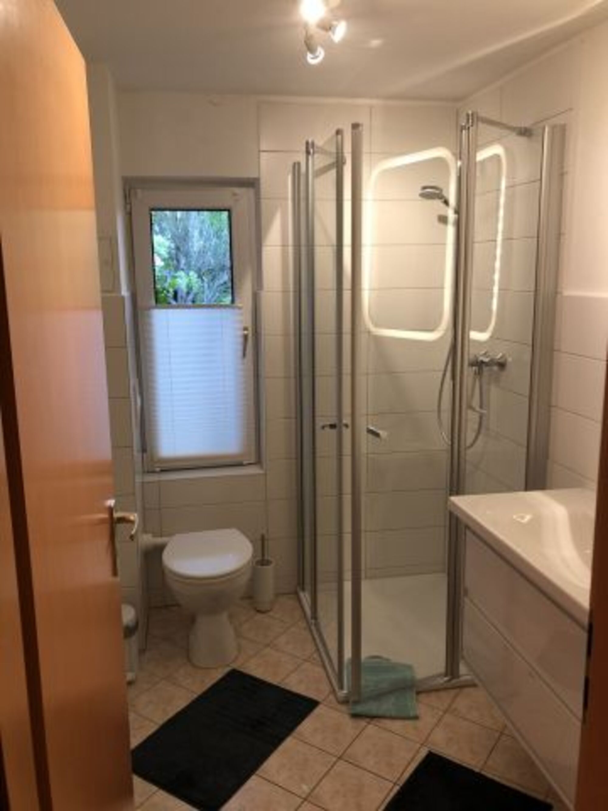 Das Bad ist als Duschbad konzipiert. Eine ebenerdige Eckdusche, die Toilette, und ein moderner Waschtisch erfüllen alle Bedürfnisse.