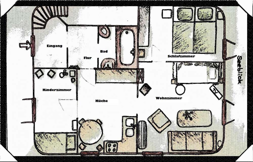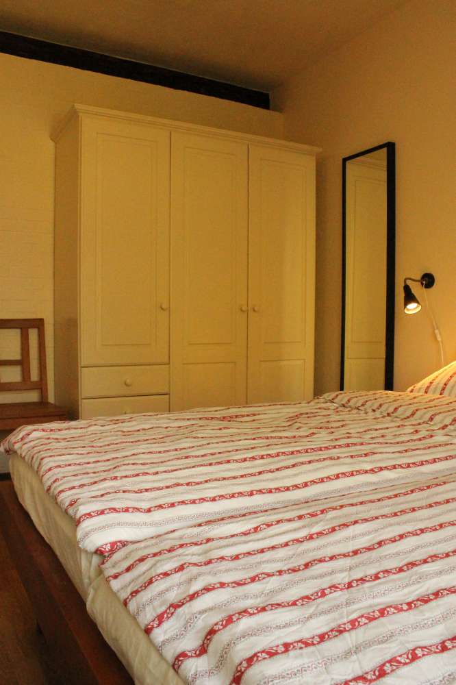 Ein Schlafzimmer mit Doppelbett, ein Kinderzimmer mit Etagenbett sowie ein Einzelbett im Wohnzimmer bieten Platz für 5 Personen. Ein Kinderreisebett und ein Kinderstuhl können bestellt werden. Kinder, die darin schlafen, werden selbstverständlich nicht in die Belegung eingerechnet. Ein Feldbett für Kinder kann für einmalig 15€ zugestellt werden.