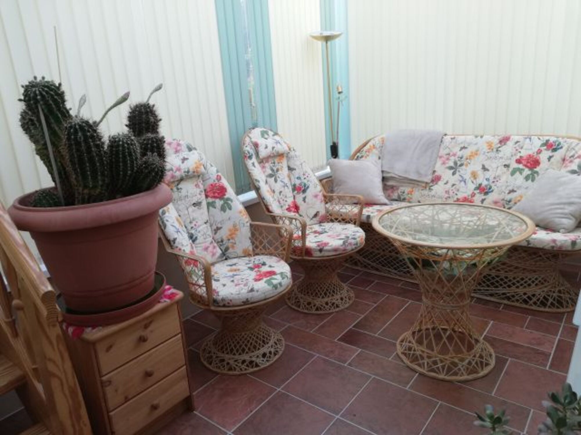 Unsere Ferienwohnung hat einen Schlafraum ( 2 Liegen nebeneinander ) ein Wohnzimmer (Wintergarten) eine kleine Küche und eine Dusche mitToilette und Waschbecken.