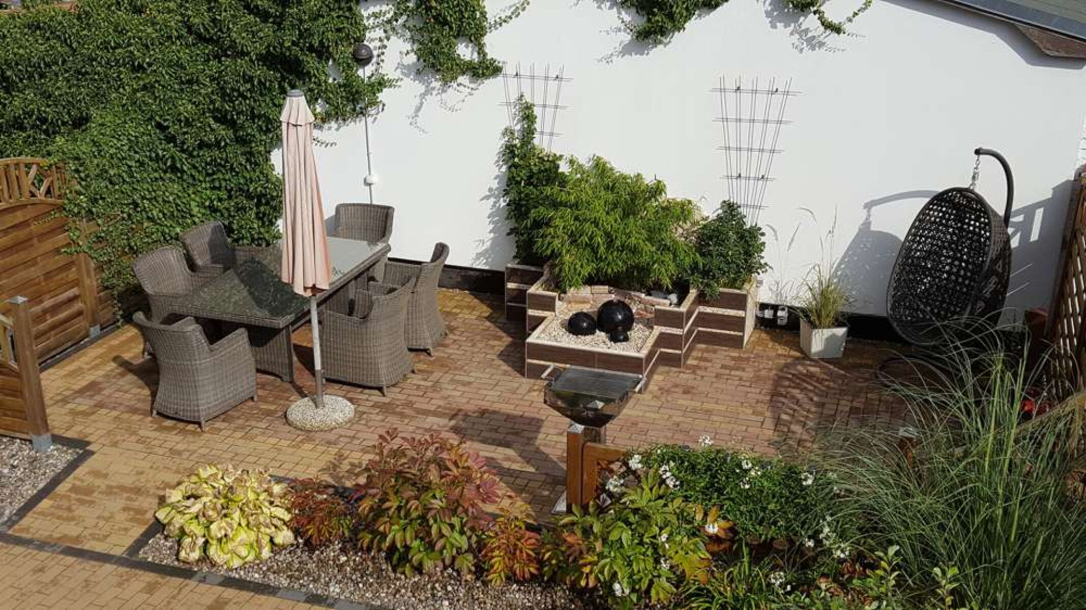 Ein besonderes Highlight der Ferienwohnung ist die großzügige, nach Süden ausgerichtete Terrasse. Hier können Sie entspannte Stunden auf Gartenmöbeln verbringen oder die Grillmöglichkeiten nutzen.
