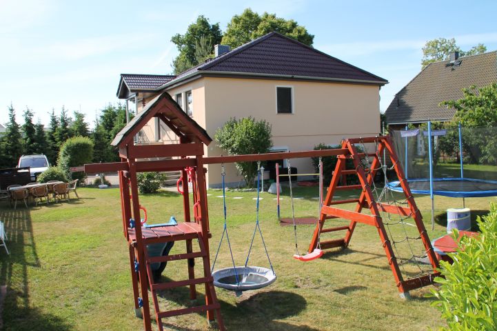 Eine Terrasse mit Grillmöglichkeit, ein kleiner Spielplatz sowie ein Parkplatz direkt am Haus stehen ebenfalls zur Verfügung.