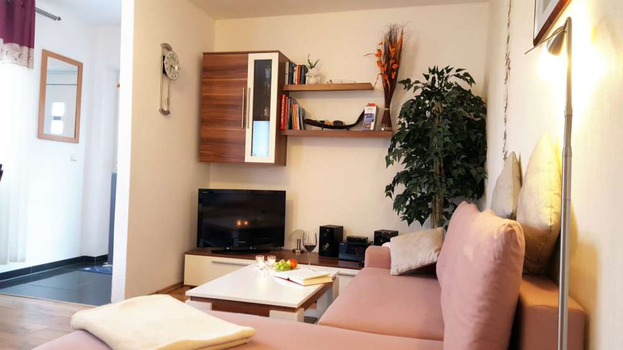 - Wohnbereich: Bequemes Ecksofa, Flachbild-TV und Zugang zum privaten Südbalkon, ausgestattet mit Gartenmöbeln und Sonnenschirm.