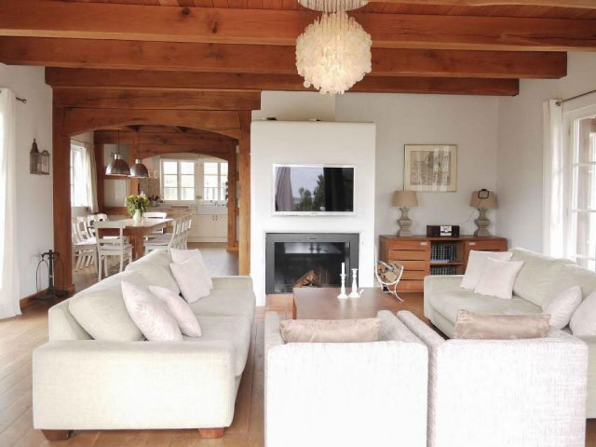 Großzügiger, gemütlicher Wohn- und Essbereich mit Kamin, TV, WLAN, hochwertiger und komplett ausgestatteter Komfortküche, drei luxuriöse Bäder, Sauna-Anlage, Garage, großer Garten mit Terrasse und Blick aufs Wasser.
