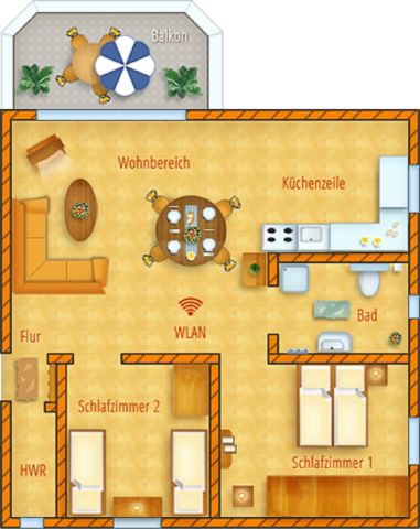 Familiär, komfortabel und stilvoll- so empfiehlt sich unser Haus mit seinen 6 Ferienwohnungen und einem Ferienhaus im Herzen von Zinnowitz, nahe dem Badestrand und der Seebrücke.Unsere 3-Zimmer-Ferienwohnung ( Typ I mit Balkon) für max. 4 Personen ist ausgestattet mit 2 separaten Schlafzimmern (Doppelbett 180x200, 2 Einzelbetten 90x 200), Bad mit Dusche/WC, Hauswirtschaftsraum, Küche mit Geschirrspüler und einem offenen Wohn- und Essbereich mit gemütlicher Eckcouch und Fernseher.