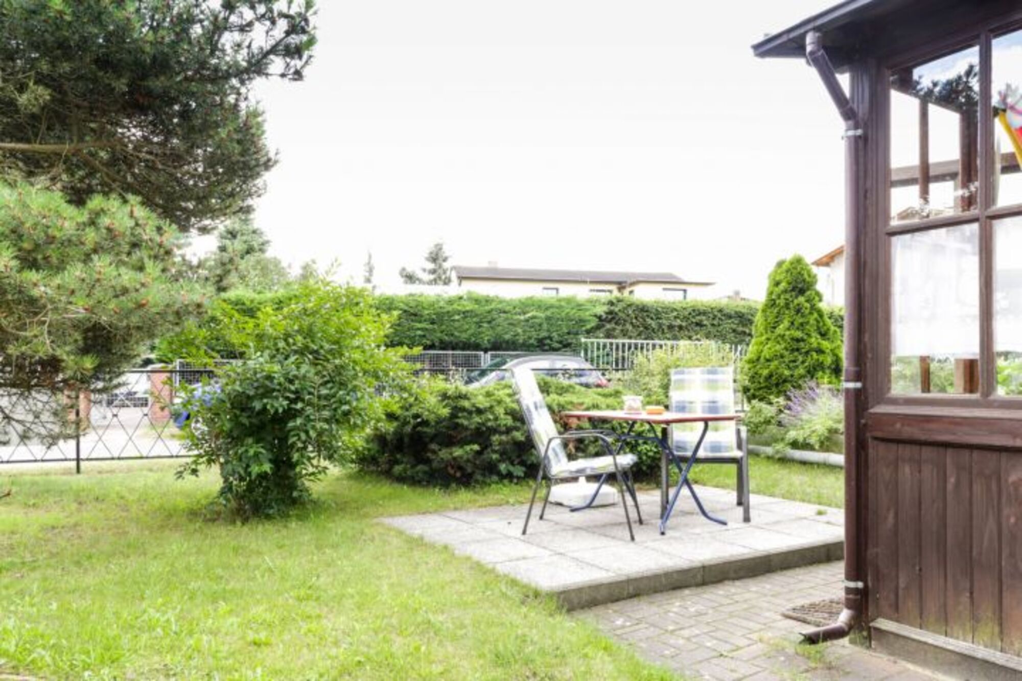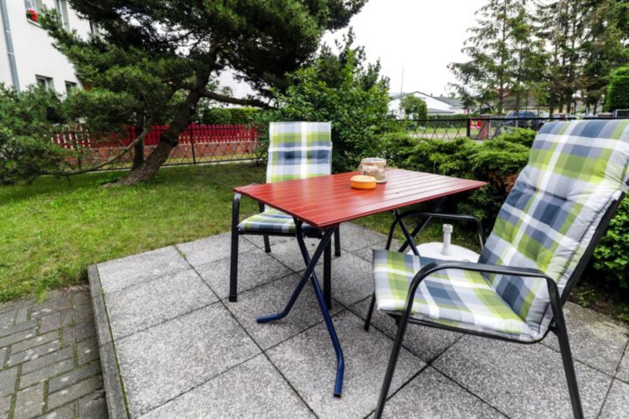 - kleiner Garten mit Terrasse und Sitzmöbel.