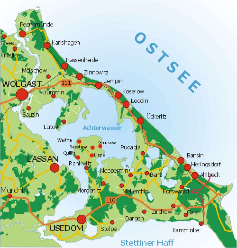Mit dem Auto fahren Sie aus Berlin kommend auf die A 11 in Richtung Stettin. Sie wechseln beim Dreieck Uckermark auf die A 20 in Richtung Stralsund und fahren bis Pasewalk Nord, um auf die B 109 Richtung Anklam zu kommen. An der Ampelkreuzung in Möckowberg ordnen Sie sich rechts ein und folgen der B 111 nach Wolgast. Kommen Sie aus Richtung Hamburg fahren Sie auf der A 1 bis Lübeck und folgen der A 20 bis Abfahrt Gützkow und folgen der B 111 nach Wolgast.Informationen zur Umgebung von Zinnowitz