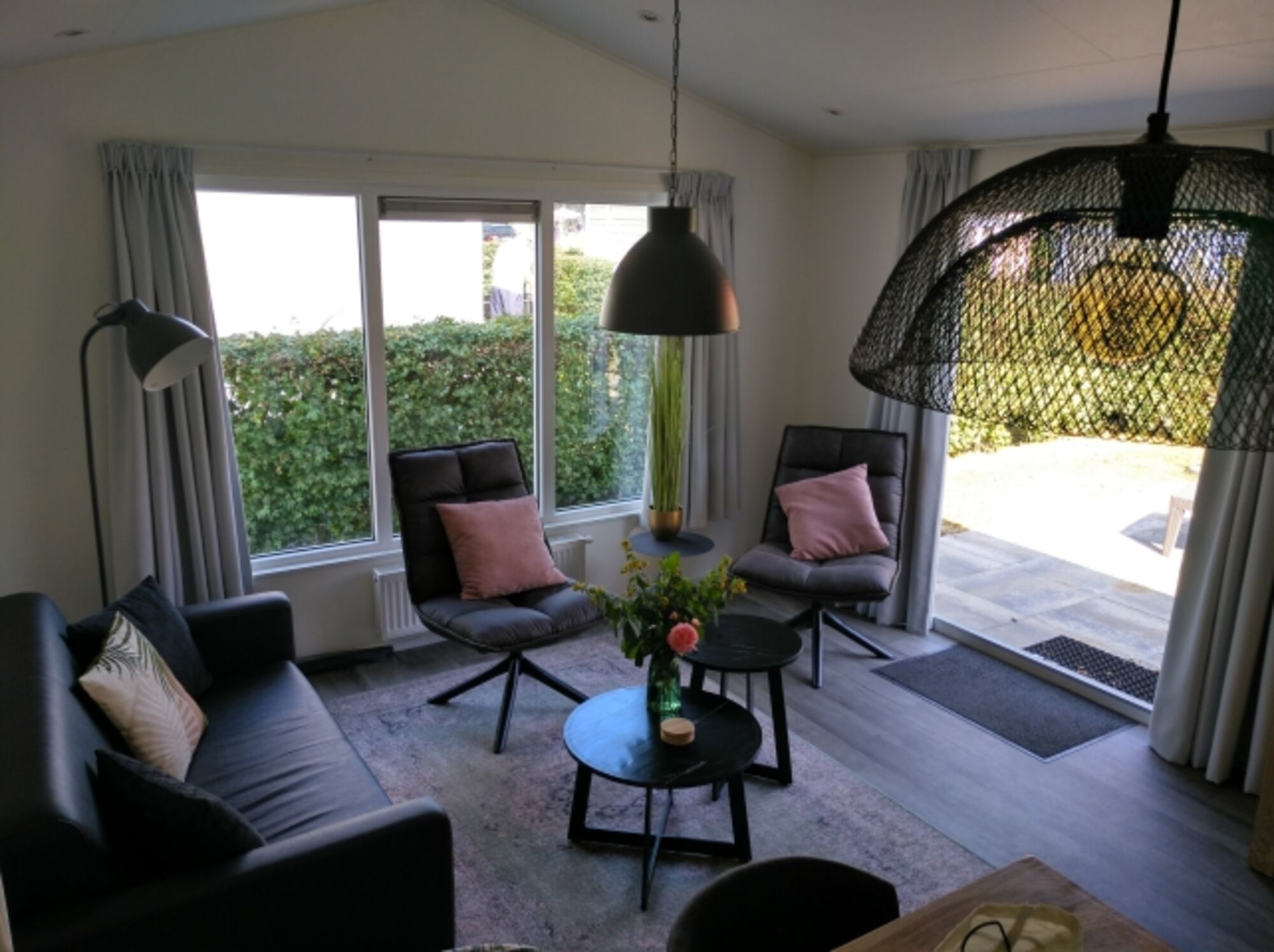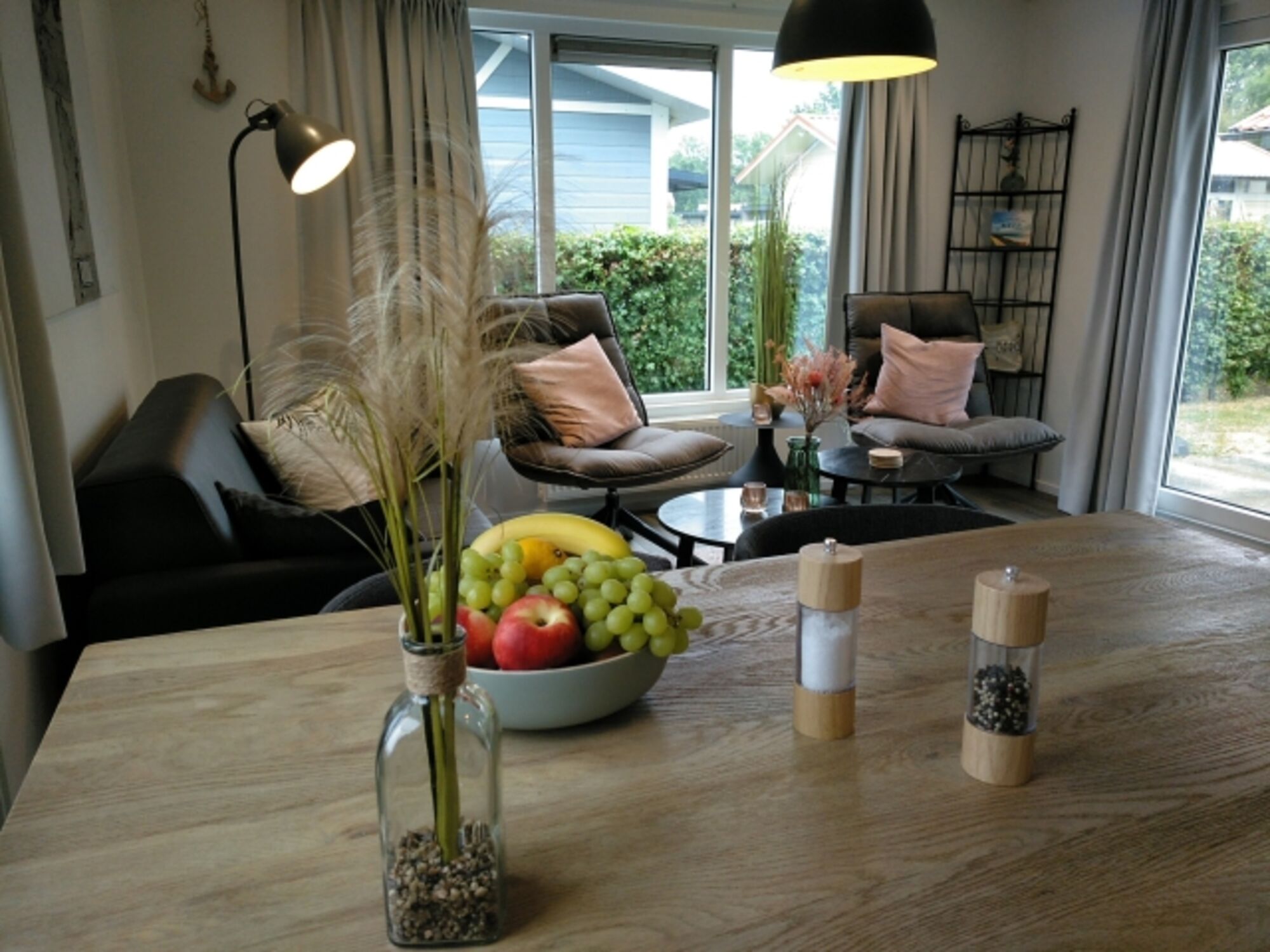 Die mit Garten- und Lounge-Möbel ausgestattete Terrasse vor dem Wohn-Essbereich wirkt durch die große Flügeltüren wie eine Erweiterung des Innenbereichs. Ein Grill für BBQ steht zur Verfügung.