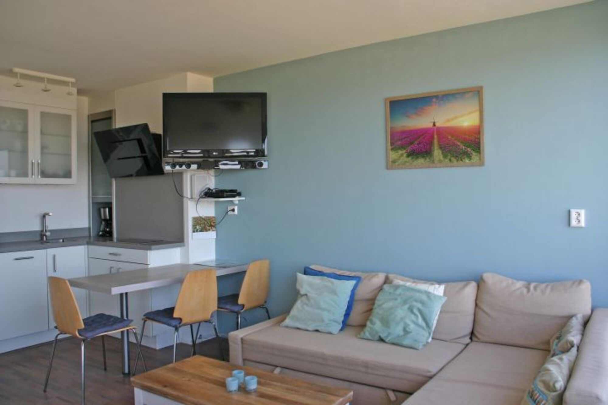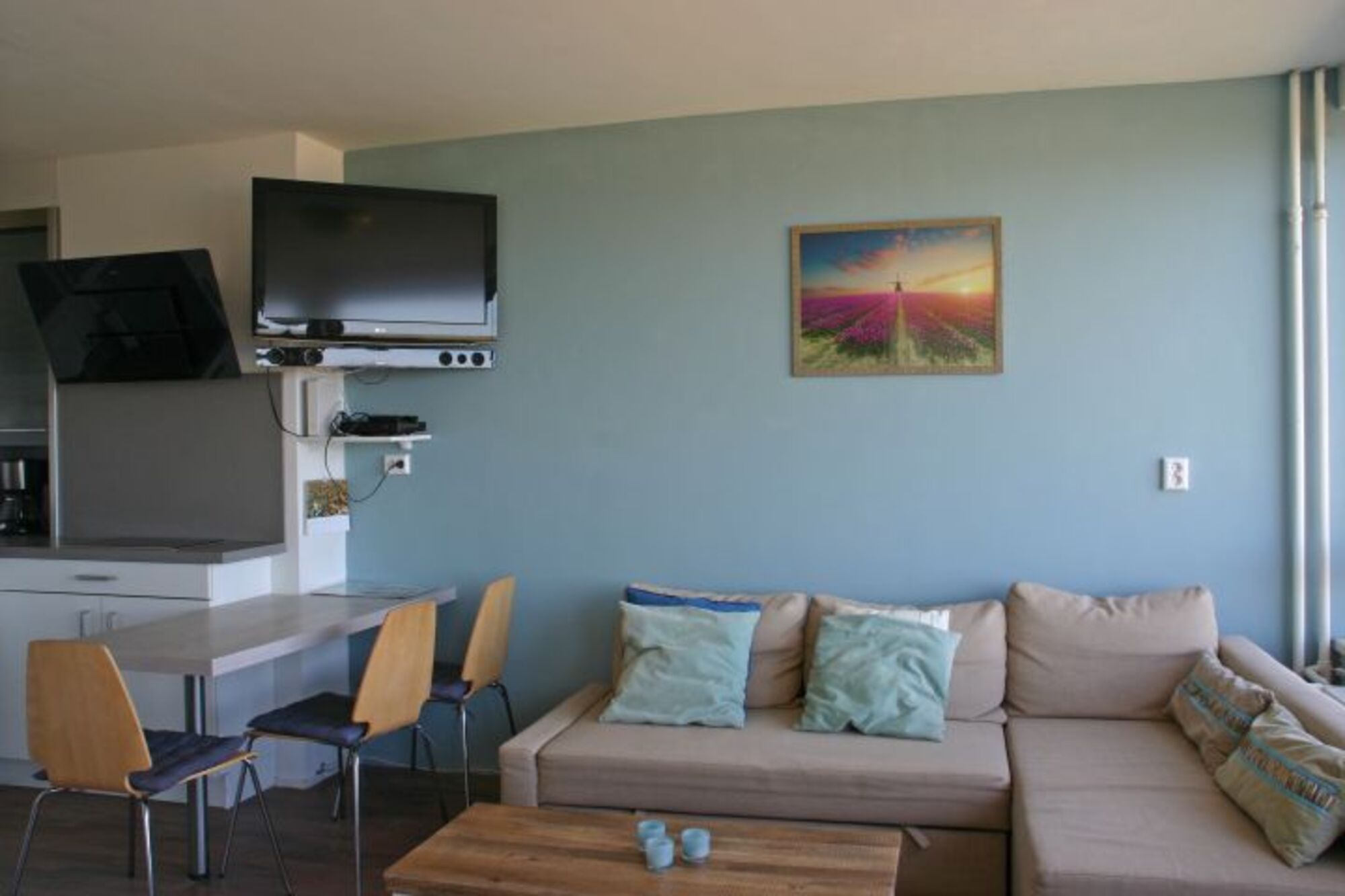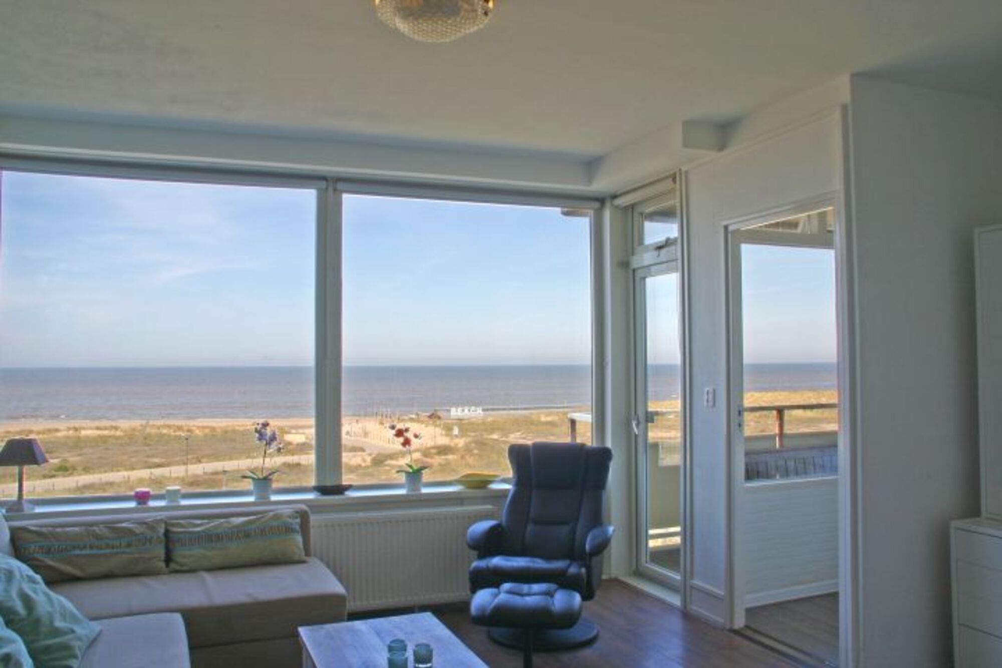 Unser tipptopp renoviertes Appartement, gleich neben dem Leuchtturm von Noordwijk, ist ideal für einen Urlaub zu zweit oder zu dritt mit einer fantastischen Aussicht auf Strand und Meer! Mit dem vom Eigentümer zur Verfügung gestellten Fernglas können Sie die schöne Aussicht in allen Details sehen.Die wunderschöne, 45qm große, Wohnung ist warm und modern eingerichtet. Sie liegt im 5. OG und ist bequem mit dem Lift zu erreichen. Der helle Wohnraum mit seiner großen Fensterfront verfügt über ein modernes Eck-Schlafsofa, einem großem Flat-HDMI-TV mit deutschem Senderpaket und einer W-Lan-Internetverbindung. Vom Wohnzimmer und dem anschließenden Balkon aus haben Sie einen atemberaubenden und ungestörten Ausblick auf die Brandung, das Meer und seine prächtigen Sonnenuntergänge!