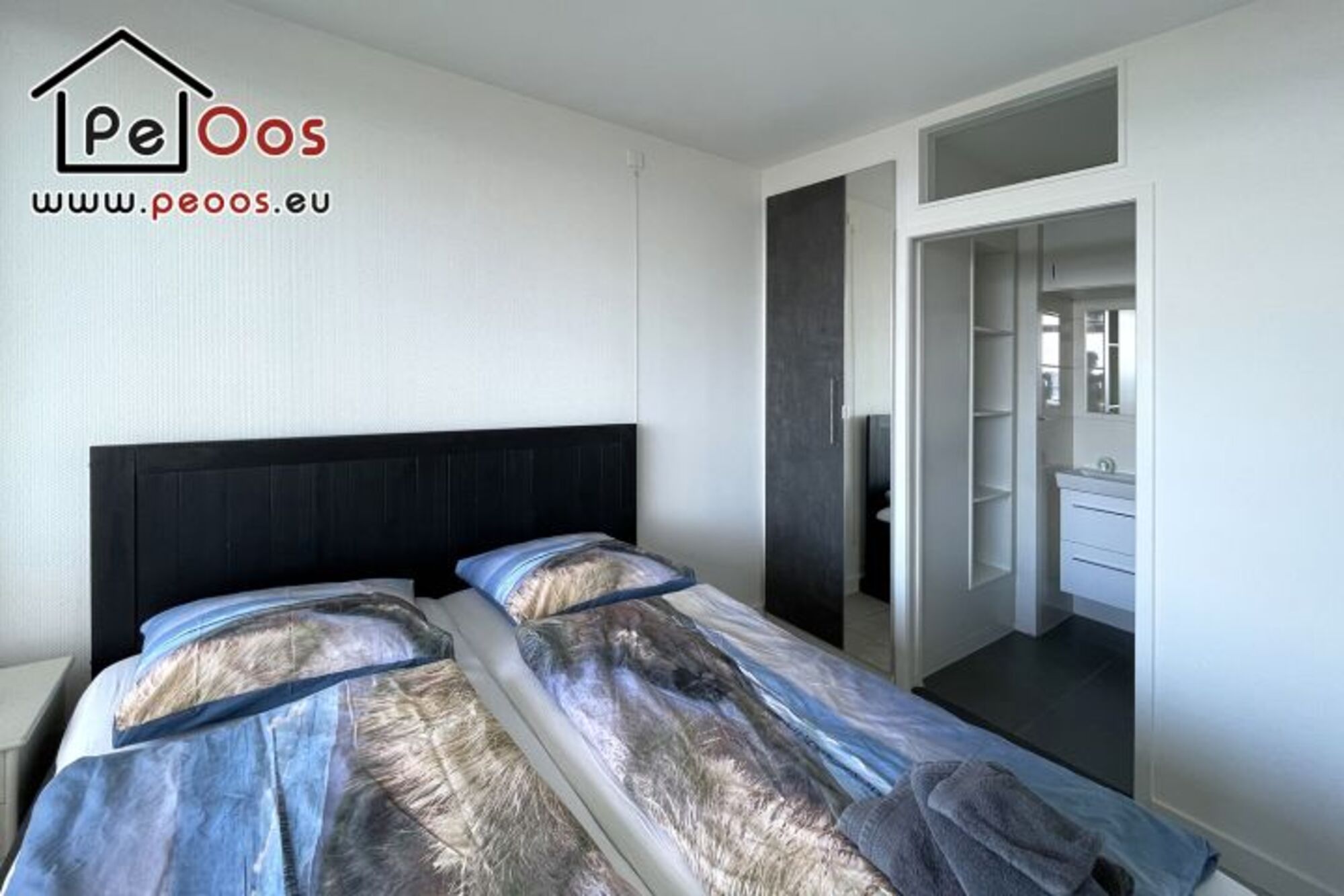 Das Schlafzimmer ist mit einem komfortablen Doppelbett und einem geräumigen Kleiderschrank ausgestattet. Auch hier bietet sich wieder eine wunderschöne Aussicht auf die Nordsee und auf den weitläufigen Strand.