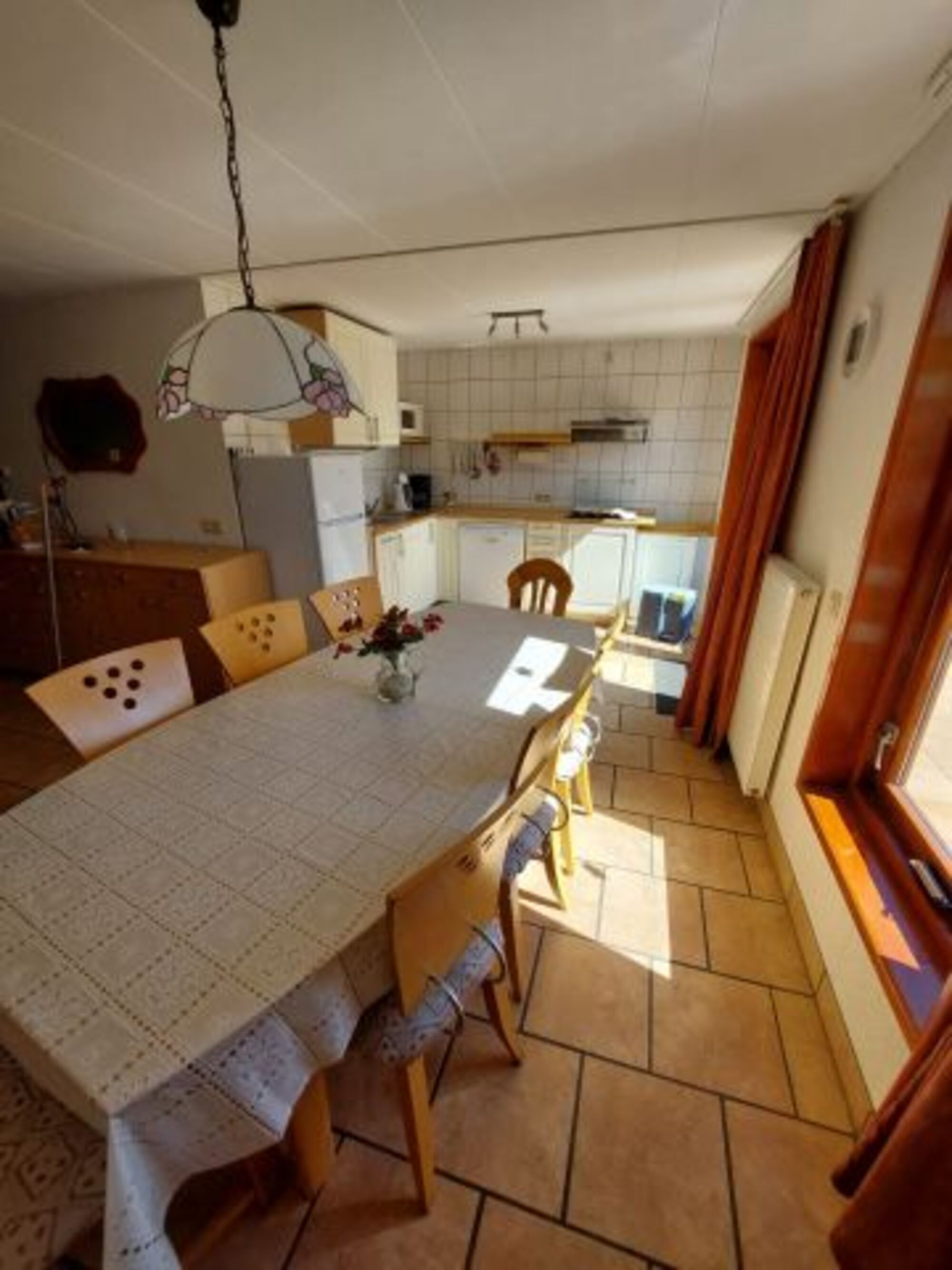 Die Einbauküche ist mit einem 4-flammigen Gasherd, Dunstabzugshaube, Einbaukühlschrank mit Gefrierfach, Spülmaschine, Mikrowelle, Minibackofen, Toaster und Kaffeemaschine ausgestattet. Ausreichend Geschirr, Gläser, Besteck u.v.m. sind vorhanden. Der Essplatz bietet mit einem ovalen Esstisch und 8 Stühlen ausreichend Platz.