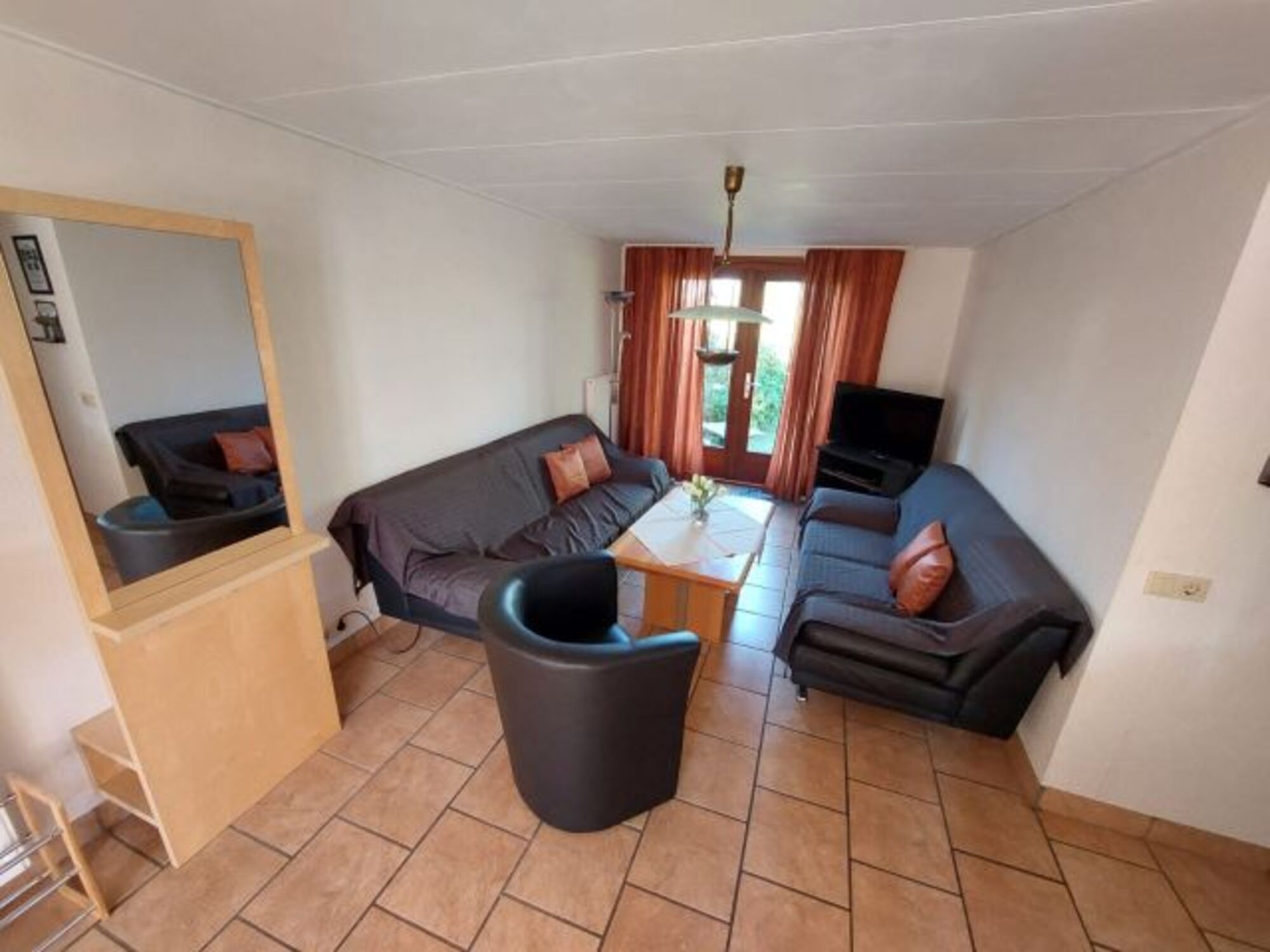 Die Sitzecke besteht aus einer Couchgarnitur (3/3/1/1), Couchtisch und SAT-TV.