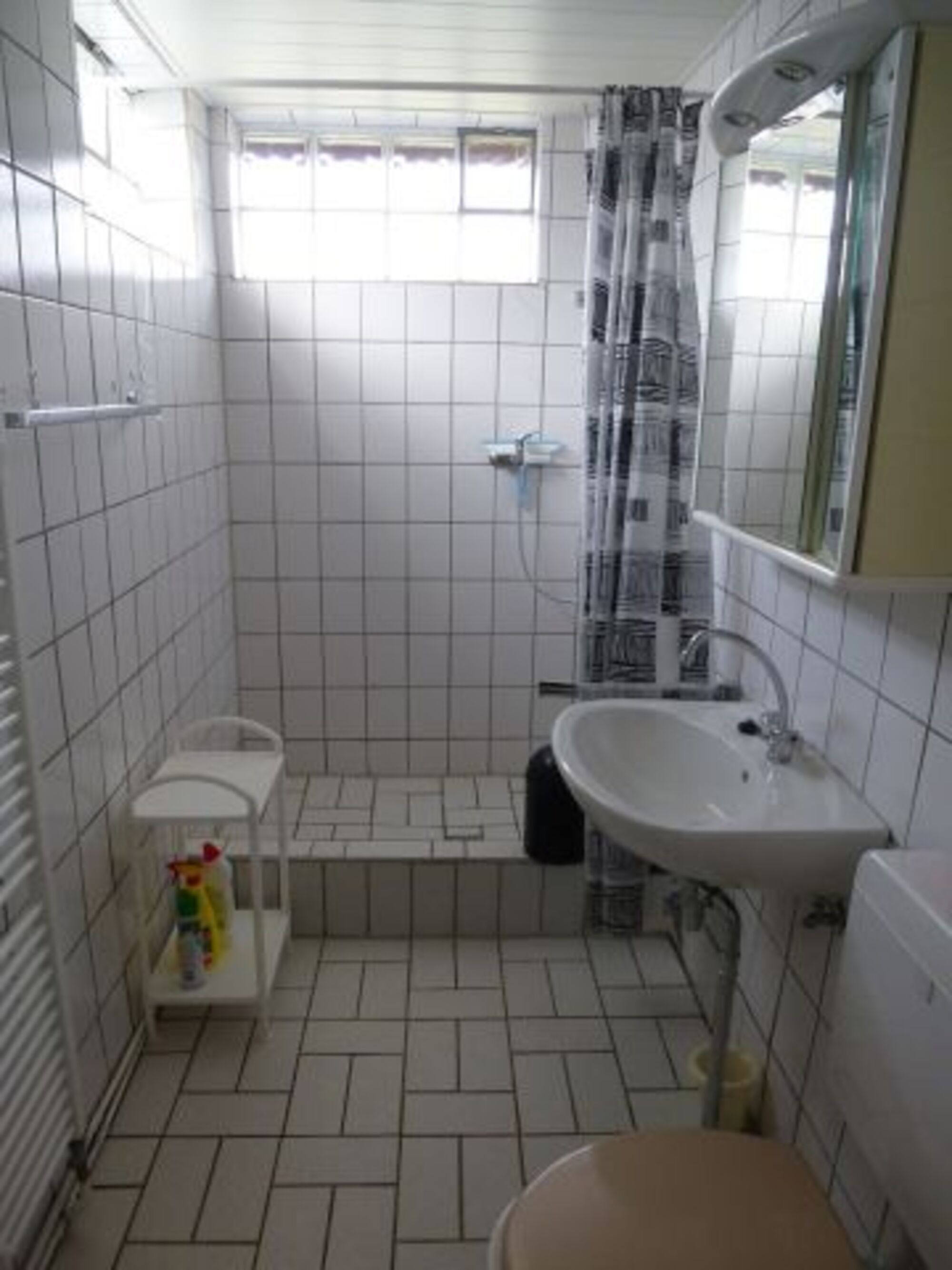 Im Bad befinden sich Waschbecken, WC und eine geräumige Dusche.