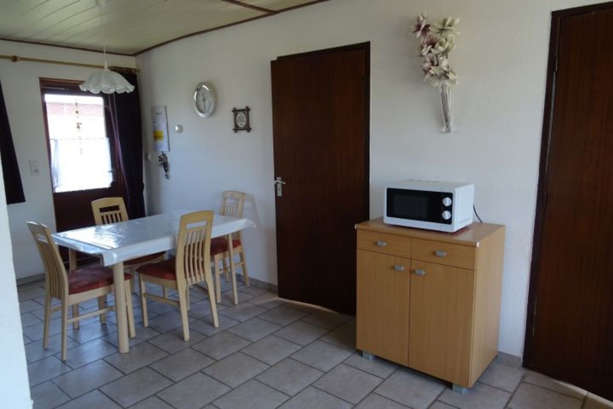 Die Küchenzeile ist mit einem 4-flammigen Gasherd, Dunstabzugshaube, Einbaukühlschrank mit Gefrierfach, Mikrowelle, Minibackofen, Toaster und Kaffeemaschine ausgestattet. Ausreichend Geschirr und Besteck sowie Töpfe u.v.m. sind vorhanden. Der Essplatz bietet mit 4 Stühlen und einem Tisch ausreichend Platz.