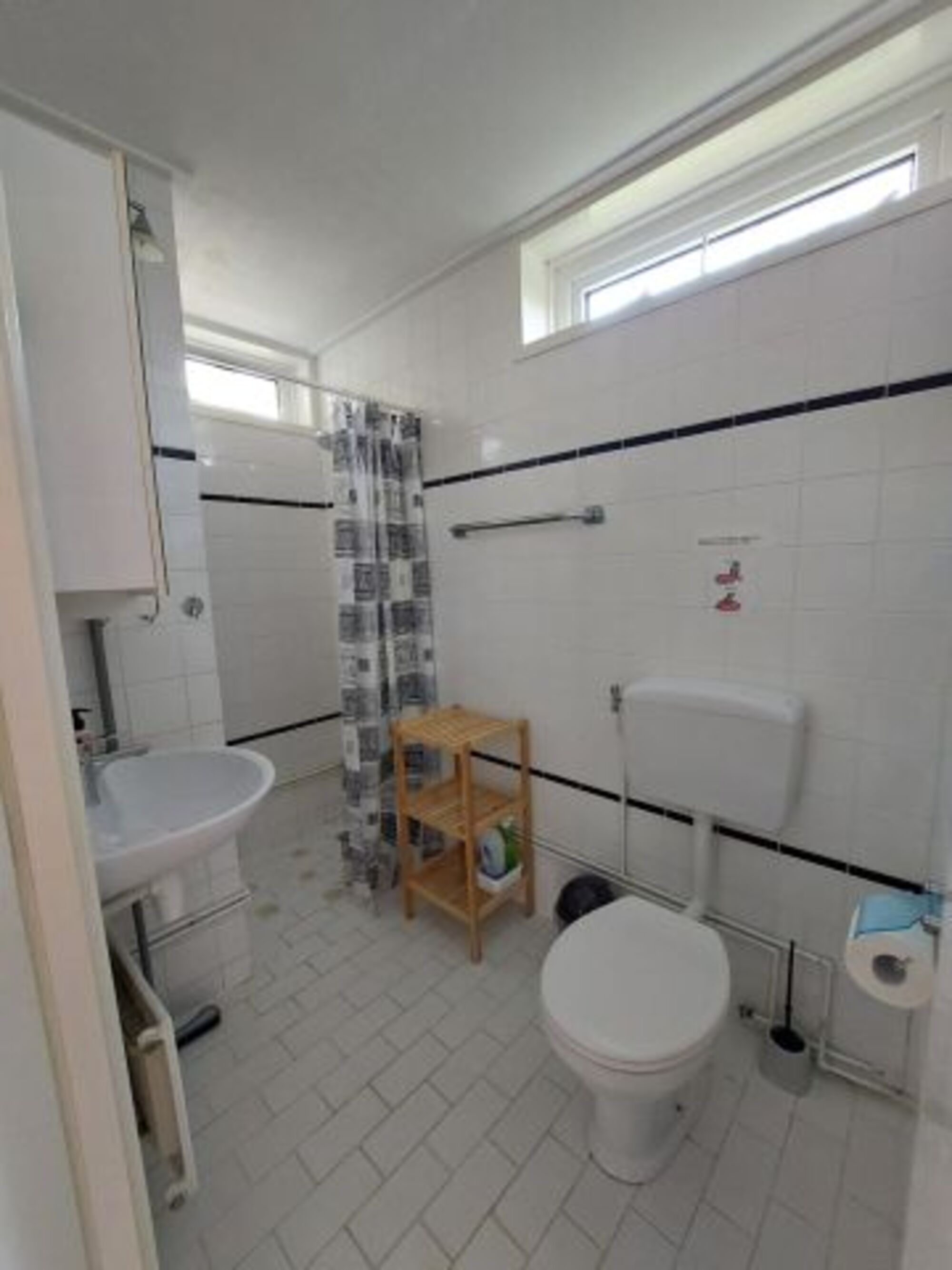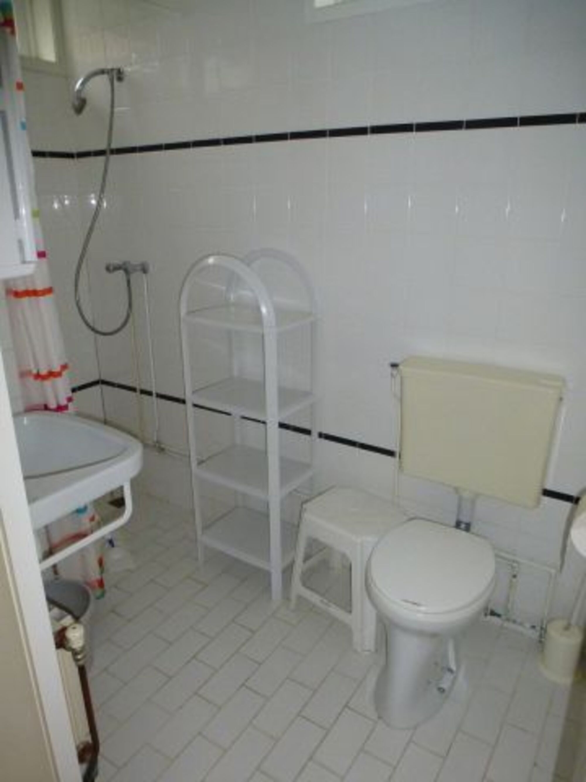 Im Bad befinden sich Waschbecken, WC und eine geräumige Dusche. Neben dem großen Schlafzimmer ist die Gästetoilette mit WC und kleinem Handwaschbecken.