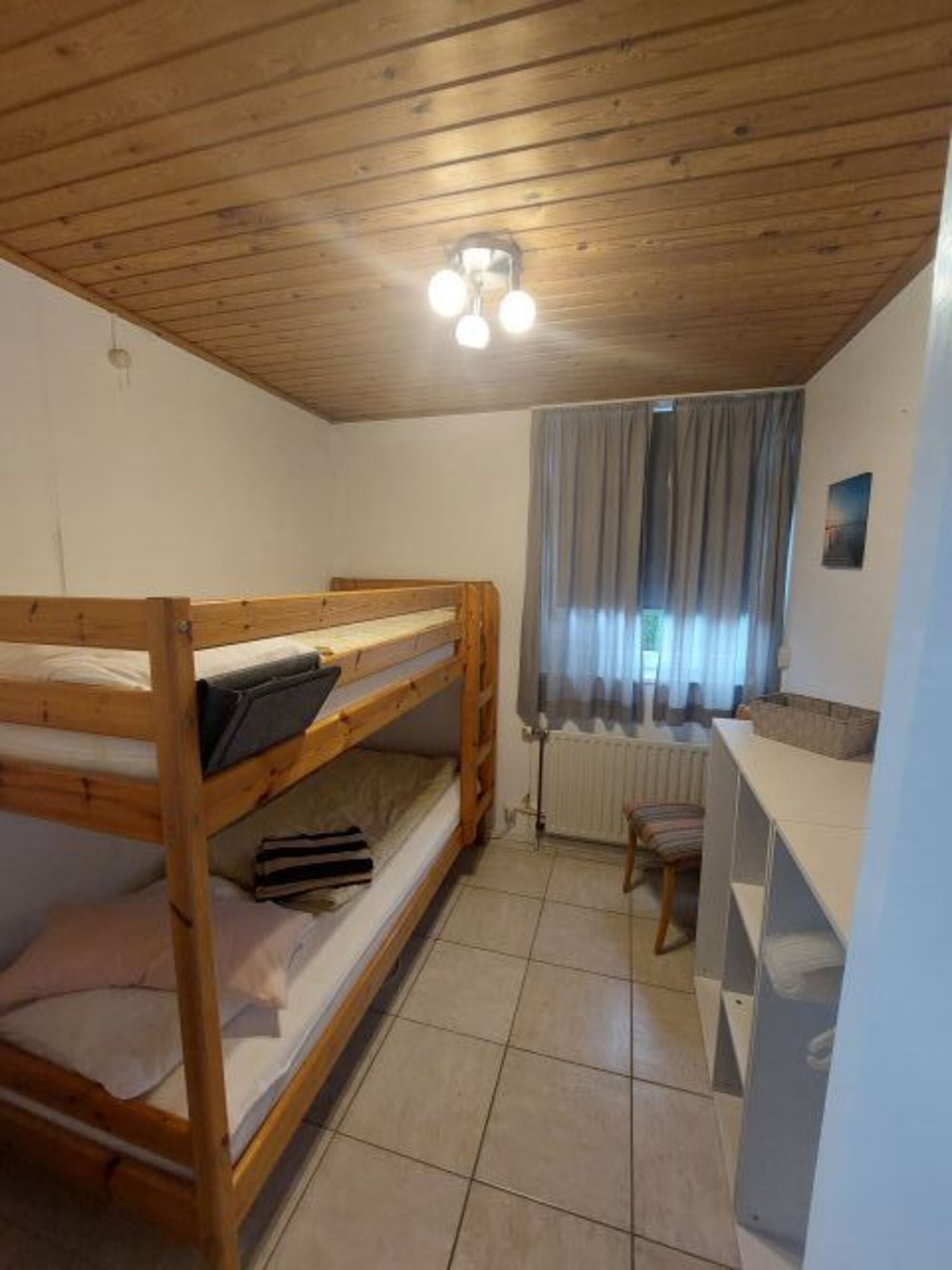 Ein Schlafzimmer mit Etagenbett 90x200m , Schrank , Sekretär und Sessel.