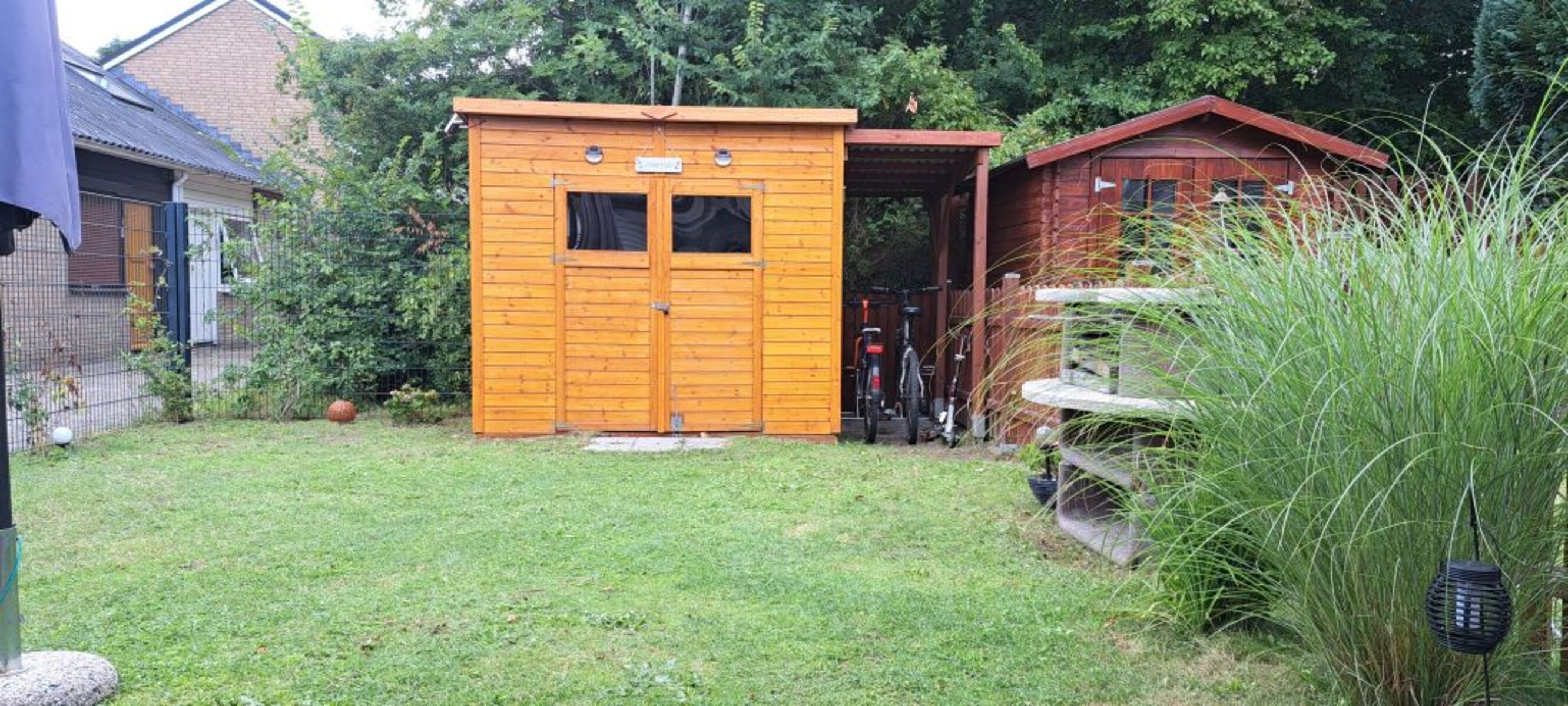 Vom Wohnzimmer aus betritt man den eingezäunten Garten mit möblierter Terrasse, Sonnenschirm und Grill. Nur die Kohle ist selbst noch mitzubringen. Ein faltbarer Bollerwagen steht im Gartenhaus für Sie bereit.