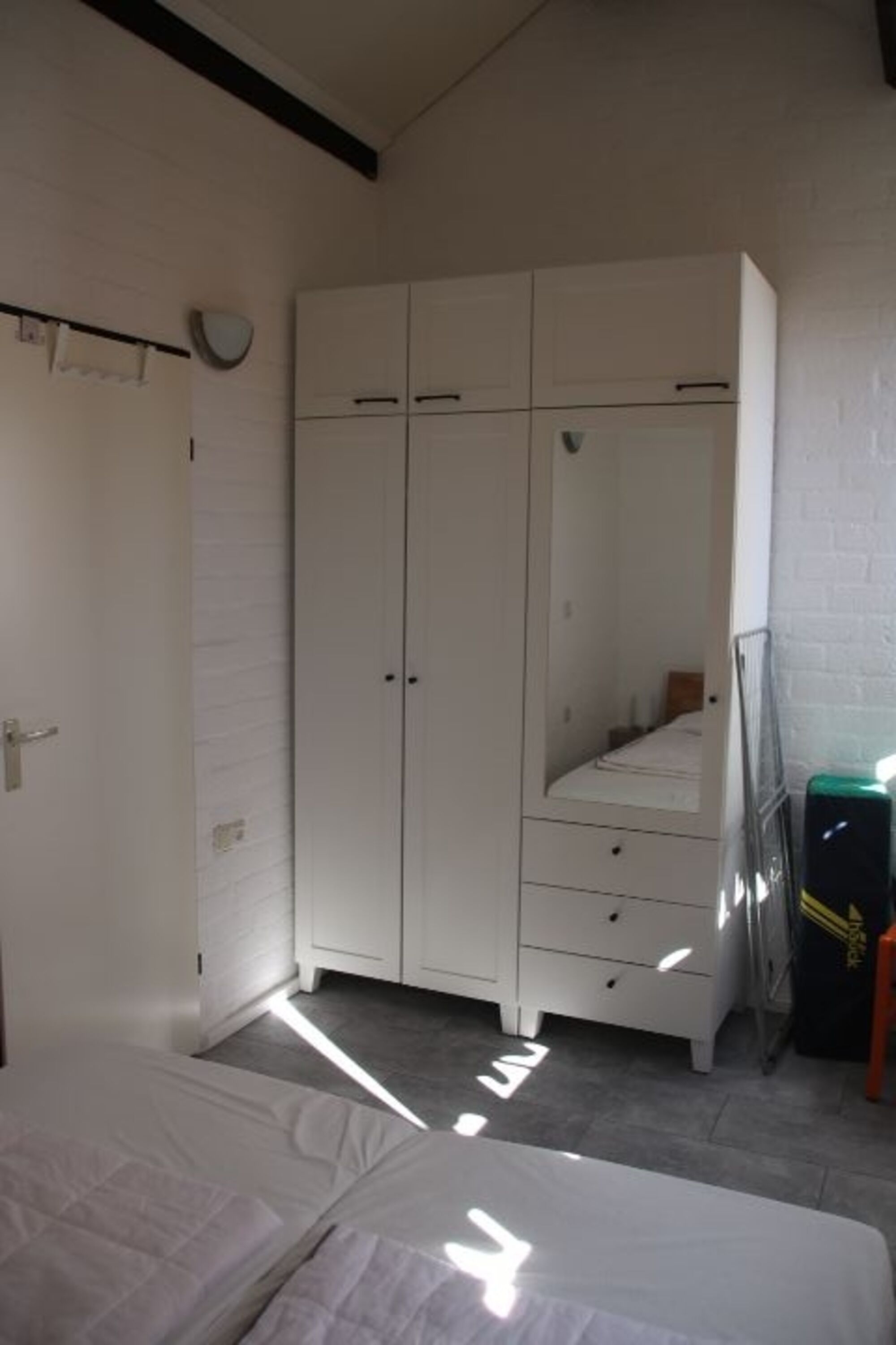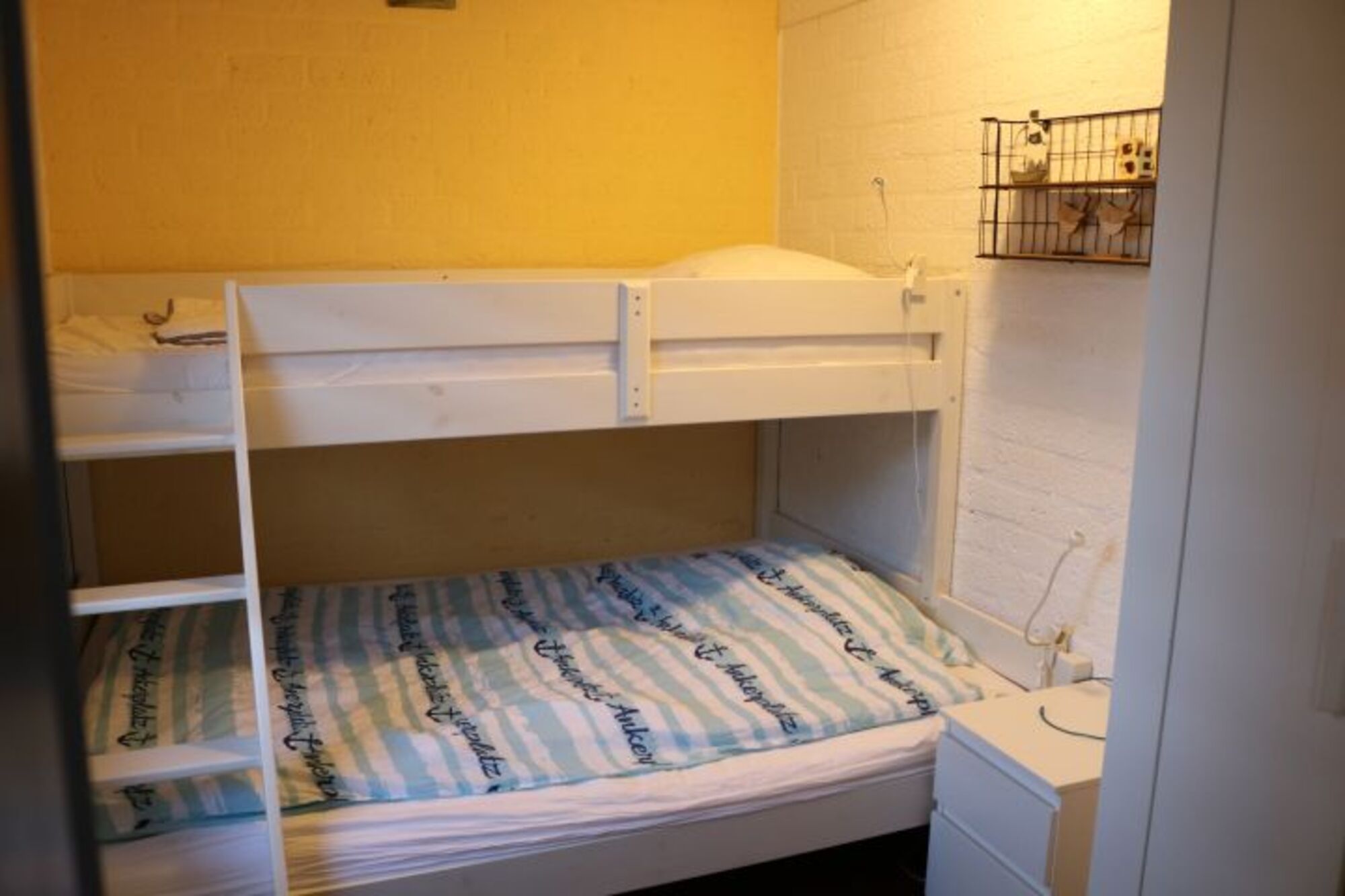 Das Schlafzimmer im Erdgeschoss hat ein Etagenbett mit 140 x 200 cm (unten) und 90 x 200 cm (oben) Liegefläche, Nachtschränkchen und einem großen Schrank mit Regalbrettern wie Kleiderstange.