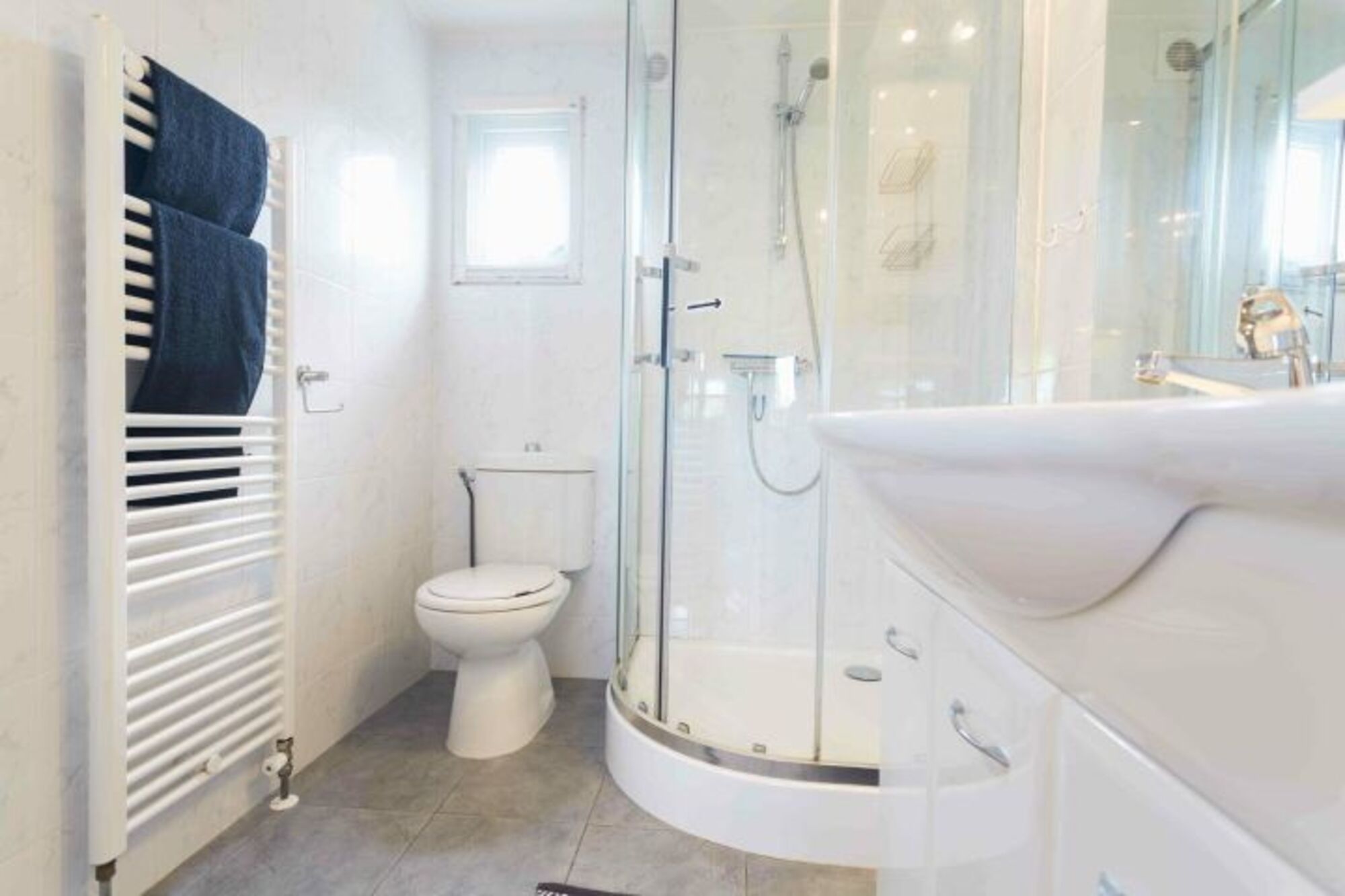 Das Badezimmer ist mit Dusche und Toilette ausgestattet.