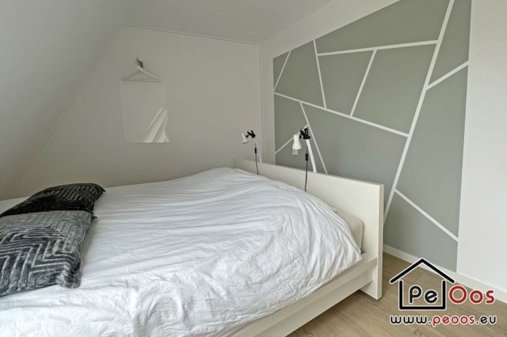 Die Treppe führt ins Obergeschoss, wo sich zwei Schlafzimmer befinden, die beide mit geschmackvollen Wänden ausgestattet sind. Das erste Schlafzimmer ist mit einem Doppelbett und das zweite Schlafzimmer mit zwei Einzelbetten ausgestattet. Das Badezimmer hat ein Waschbecken, eine Dusche und eine Toilette.