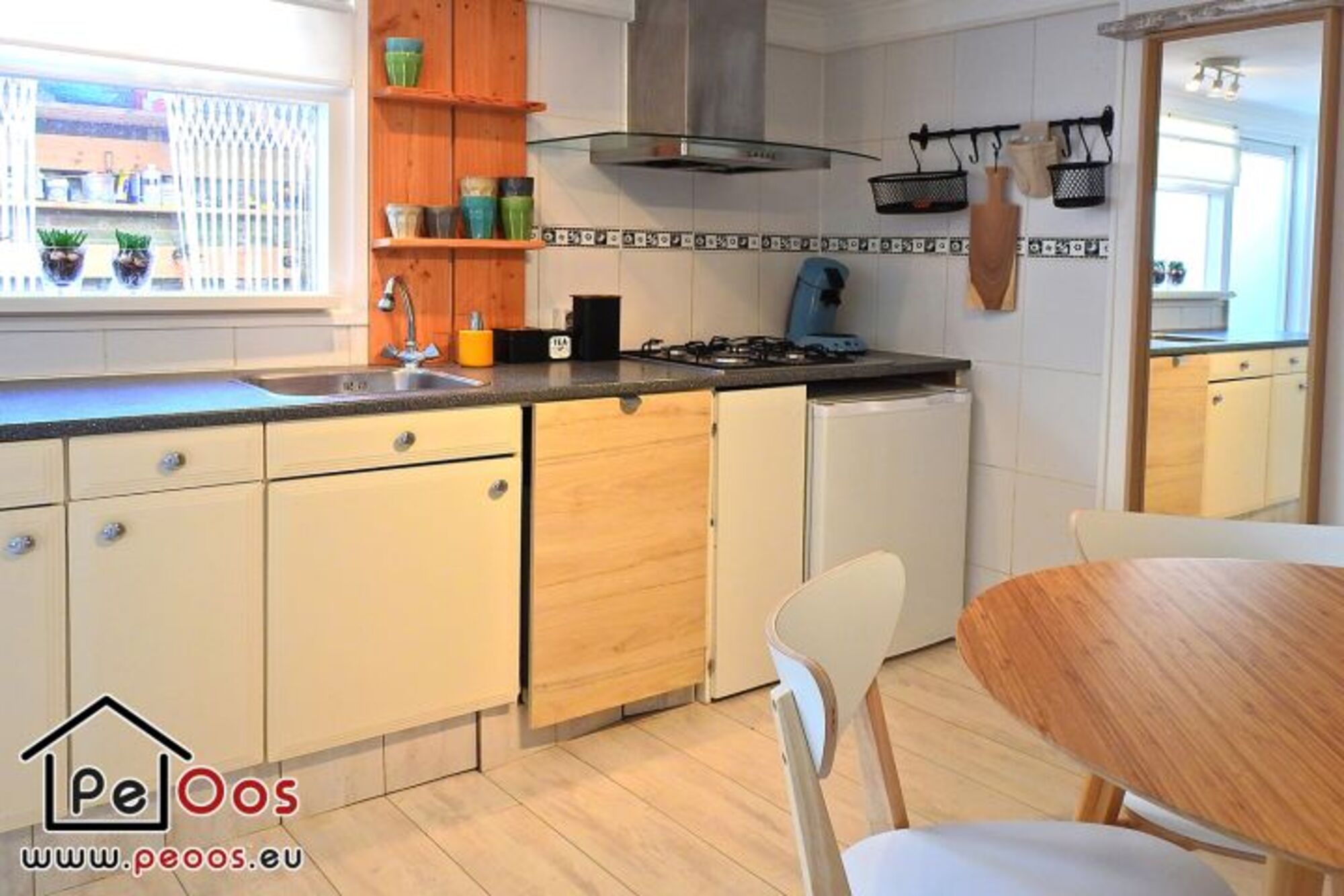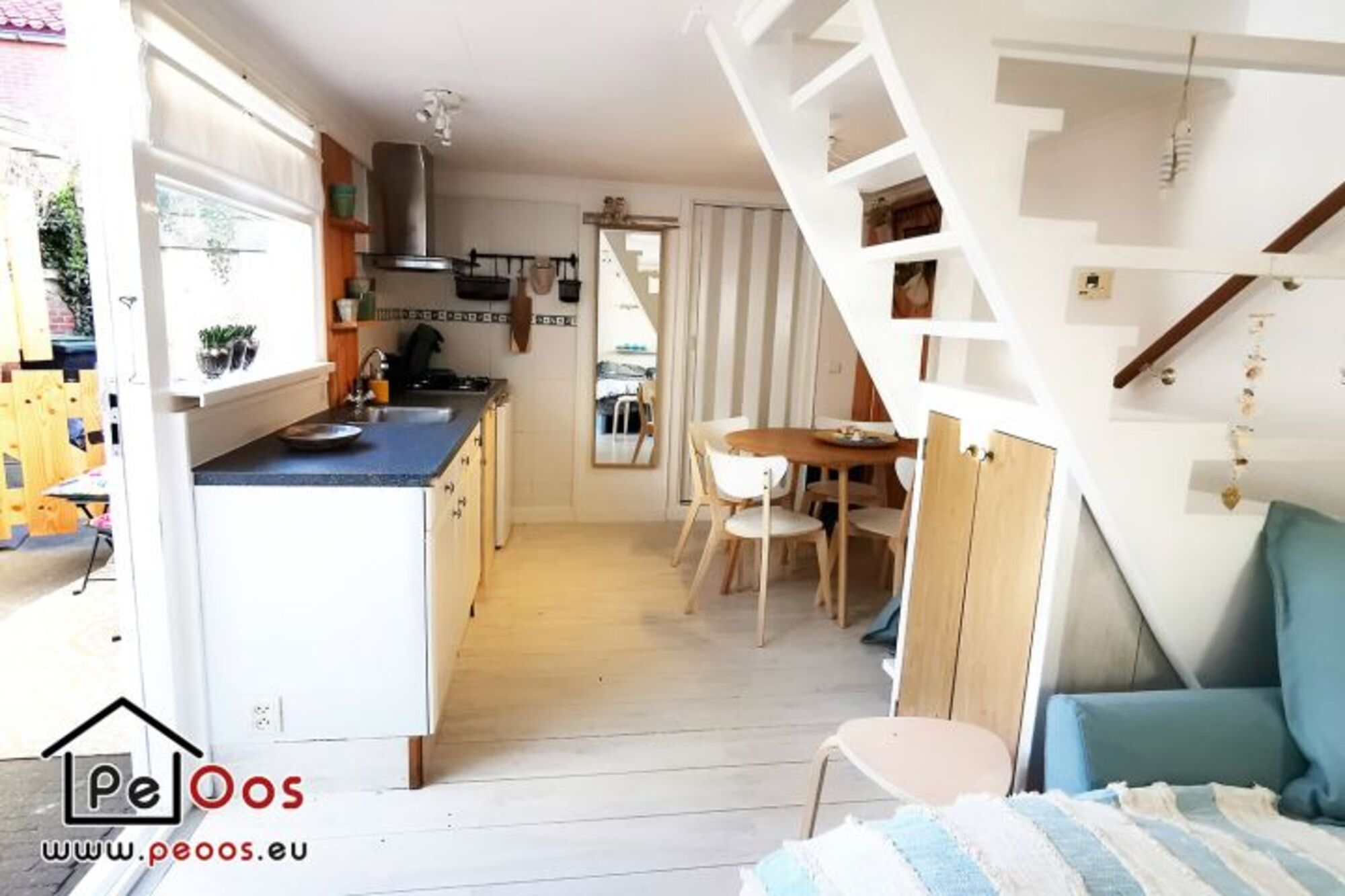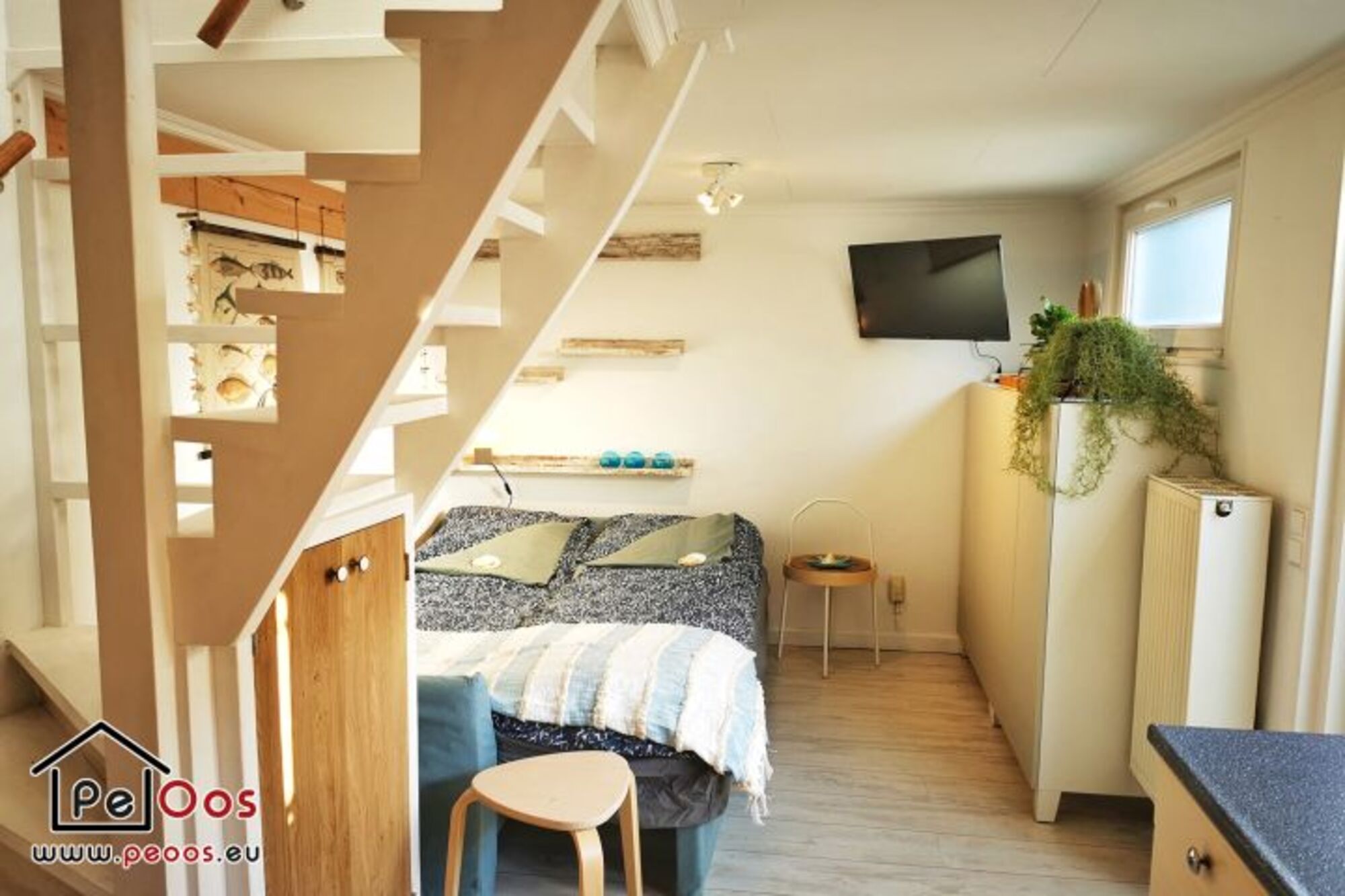 Das Wohnzimmer ist wunderbar hell, mit einem Schlafsofa, einem Flachbildschirm und einem runden Esstisch ausgestattet. Die Küche ist modern und verfügt über einen Geschirrspüler. Im Erdgeschoss befindet sich das Badezimmer mit Dusche, Waschbecken und Toilette. Außerdem gibt es einen Handtuchwärmer und einen Haartrockner.