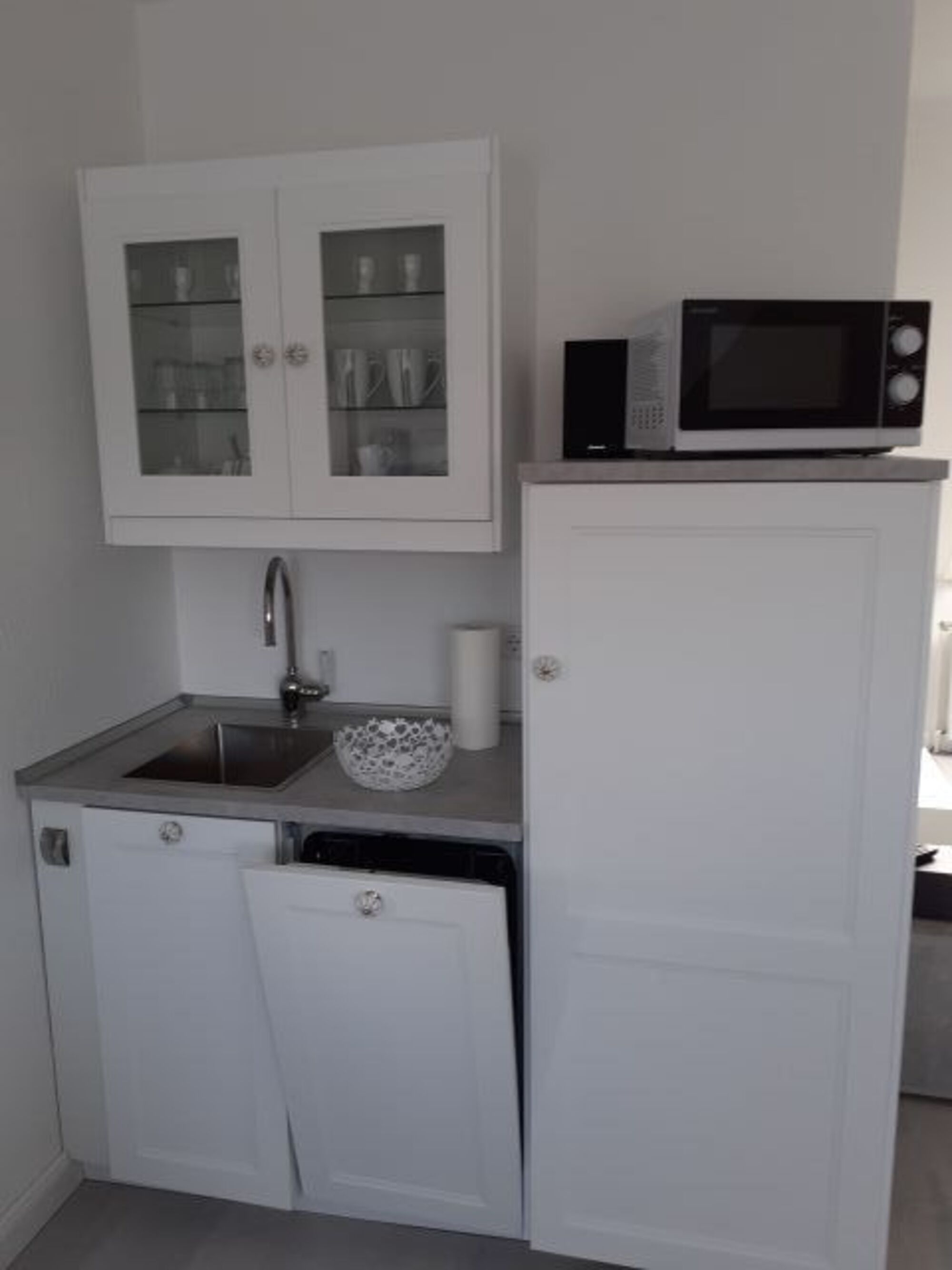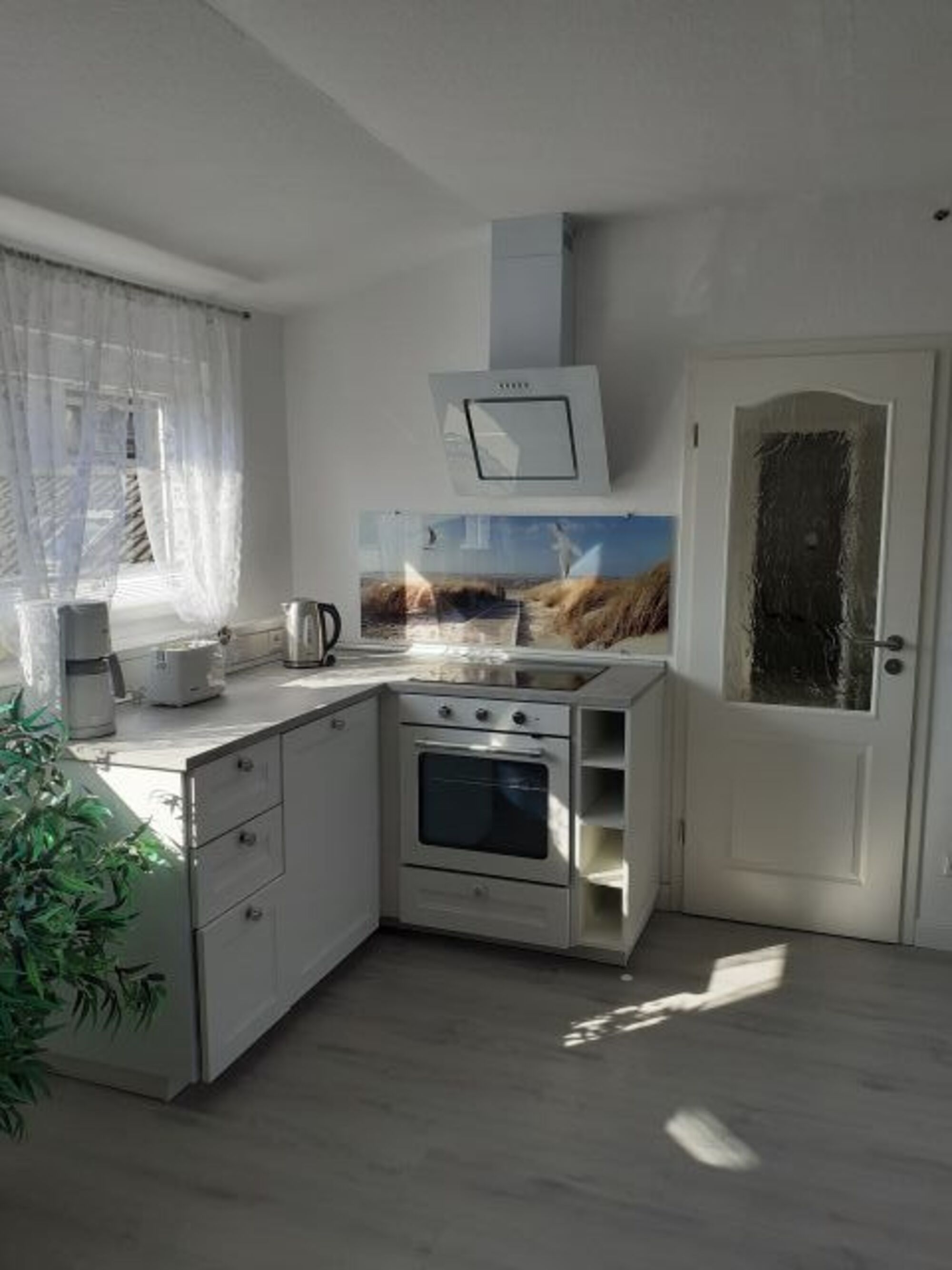 Die Ferienwohnung ist in grau-weiß eingerichtet und es ist alles vor Ort, was ein Haushalt benötigt.Eine kleine eigene Sitzgelegenheit mit einer schönen Set für die Gemütlichkeit und einen Sonnenschirm ist direkt vor unserem Haus nur für Sie.