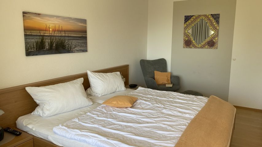 Separates Schlafzimmer mit Doppelbett, gemütlichem Relax-Sessel und 2. Flachbild-TV.