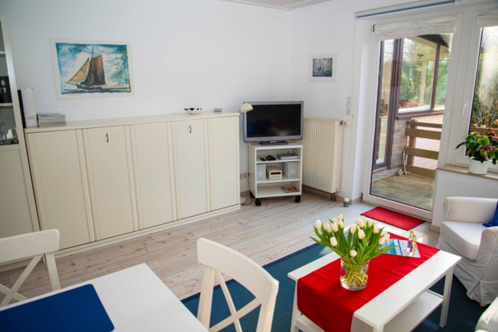 Die Wohnung Steuerbord ist mit 3 Sternen zertifiziert, bietet Platz für 3 Gäste und besteht aus einem Schlafzimmer mit Doppelbett, einem Wohnzimmer mit hochwertigem Schrankbett, Küchenzeile und Bad.Direkter Zugang zum Garten über einen kleinen Balkon.Im Mietpreis ist alles inklusive vom Handtuch bis zum Toilettenpapier, Bollerwagen steht zur Verfügung.
