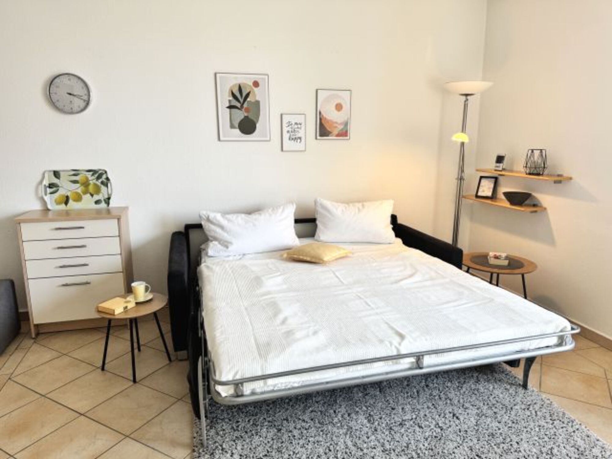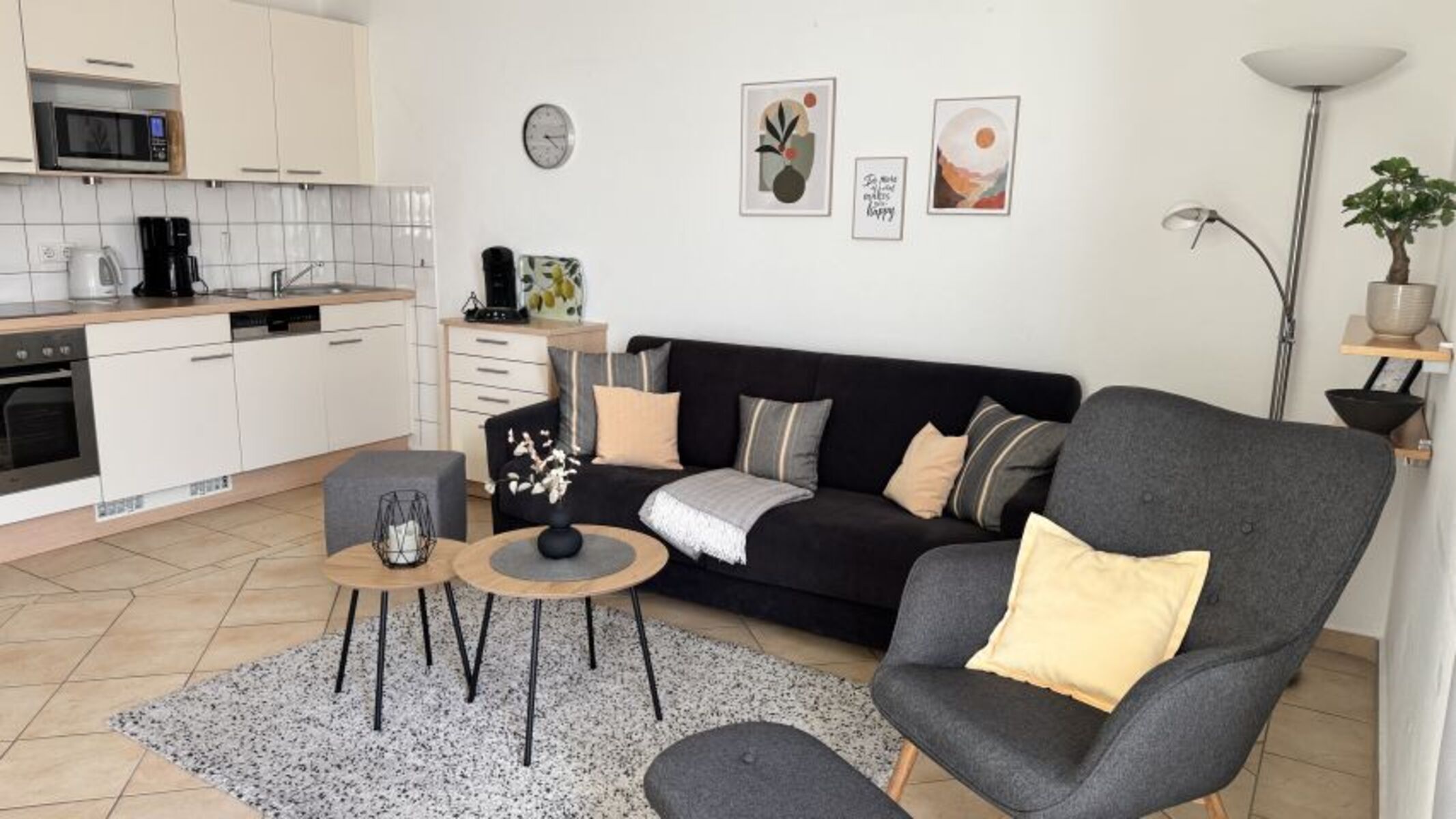 Neu eingerichtetes helles Wohnzimmer mit gemütlicher Sitzecke, bequemer Schlafcouch mit Lattenrost und Matraze 160x190.