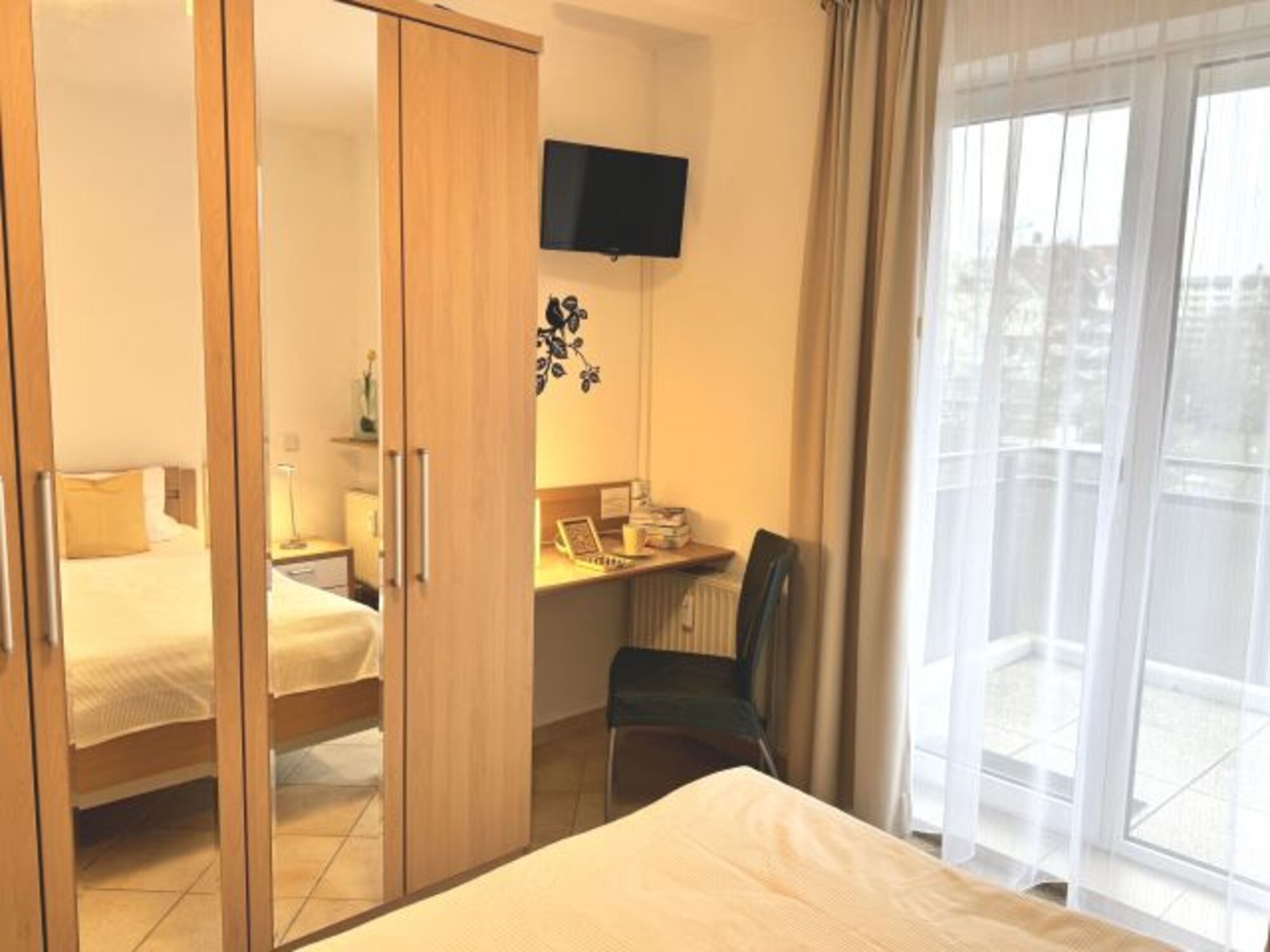 Separates Schlafzimmer mit Doppelbett 200x200, großem Kleiderschrank, Schreibplatz, Spiegel. Möblierter Balkon.