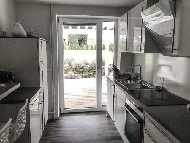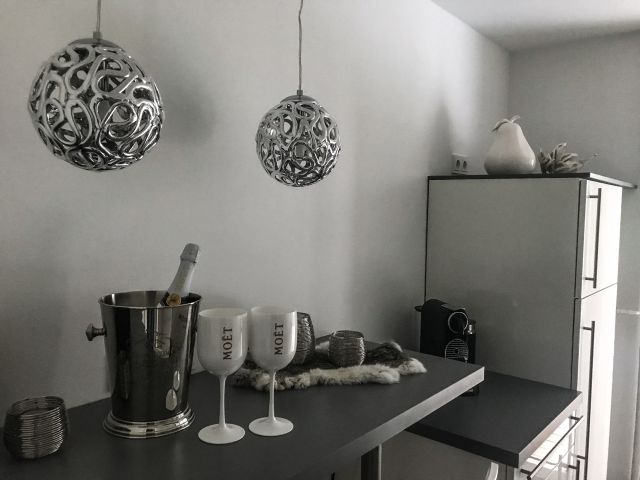 Ihre moderne Design-Küche im edlen weiß/grau bietet Ihnen mit Geschirrspüler, Backofen und einer kompletten Ausstattung alles, was auch ambitionierte Hobbykochherzen höher schlagen lässt. Den Nespressosüchtigen unter Ihnen, steht ein DeLonghi Maschinenklassiker mit separatem Milchbehälter zur Verfügung.