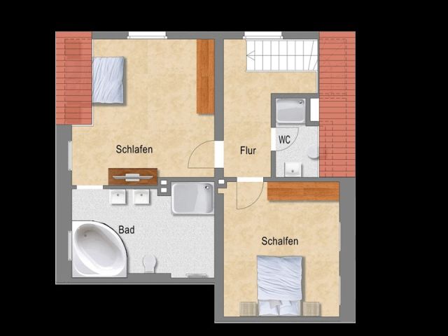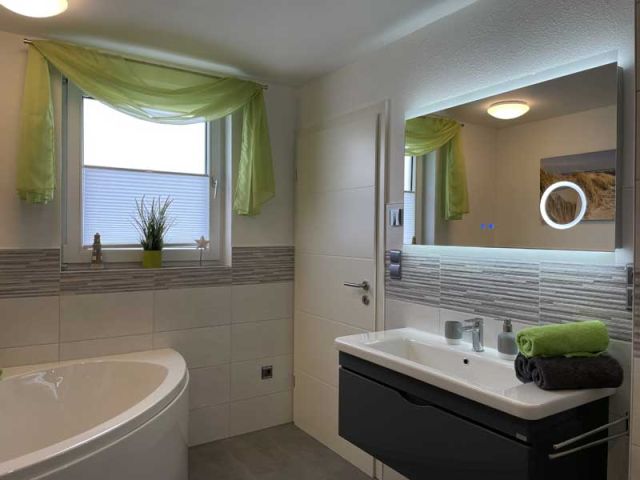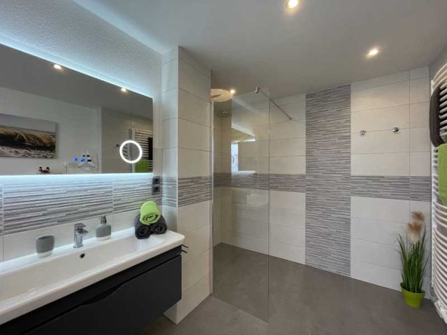 Im Obergeschoss finden Sie die anderen zwei Schlafzimmer mit bequemen Boxspringbetten und die beiden Bäder. Das Masterbad ist mit einer Badewanne und einer bodengleichen großen Dusche mit Regenbrause ausgestattet. Das zweite Bad ist ein Duschbad.