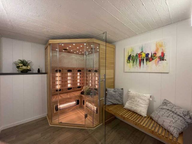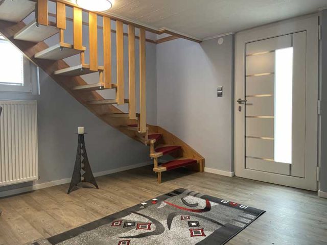 Im Untergeschoss befindet sich der Eingang zum Ferienhaus. Im großen Eingangsbereich ist die Garderobe, ein kleiner Arbeitsplatz und eine Infrarotsauna untergebracht.