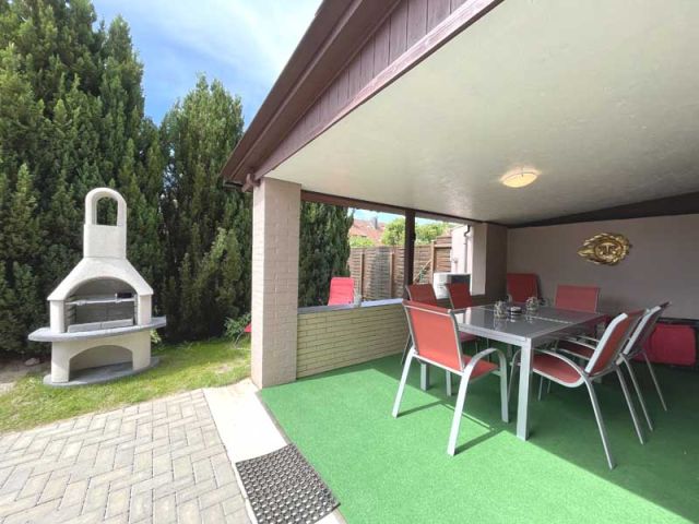 Die überdachte Terrasse ist vom Eingangsbereich aus begehbar und grenzt an den komplett eingezäunten Garten. Der Zaun ist ca 125cm hoch.
