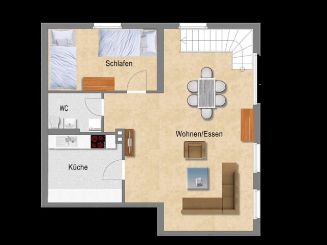 Über eine offene Holztreppe gelangen Sie in das eigentliche Erdgeschoss - hier finden Sie ein großes Wohn - und Esszimmer, die vollausgestattete Küche, ein Gäste WC mit Waschmaschine und ein Schlafzimmer mit zwei Einzelbetten.